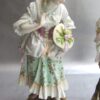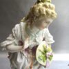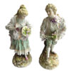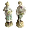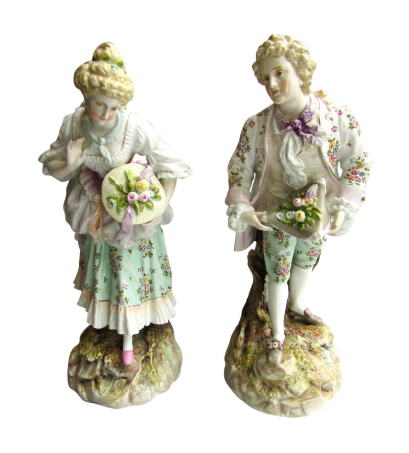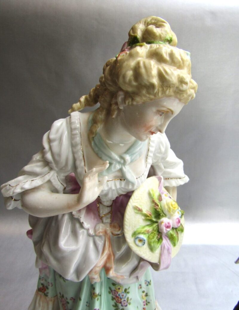 v** SOLD ARCHIVES **vA wonderful pair of large, 19th Century German porcelain figurines showing a man and woman in colourful period costumes. Colourfully hand painted – the woman with bonnet topped with flowers in her hand – the other hand up showing her hand, the gentleman also with his hat in his hands – his hat also has flowers attached