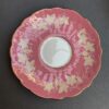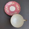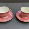 A lovely pair of pink cups and saucers with white enamelled leaf decoration.