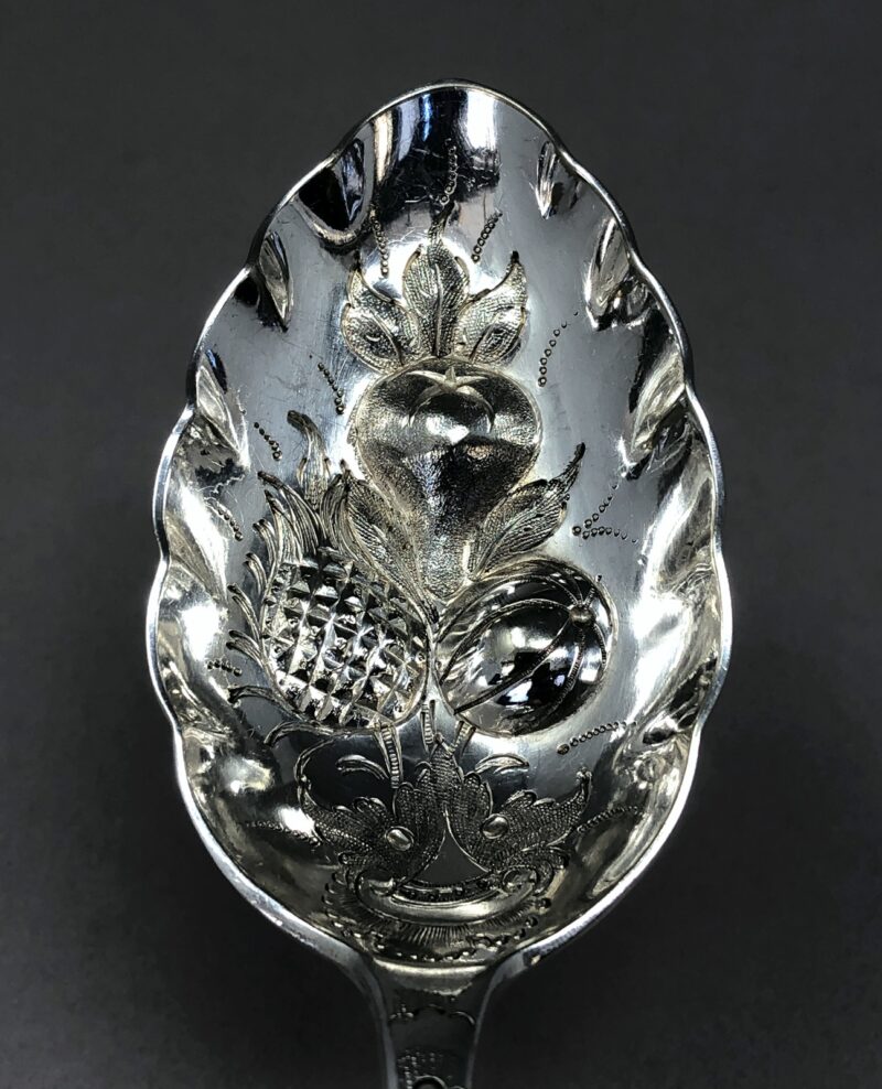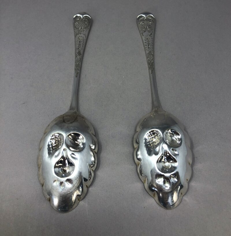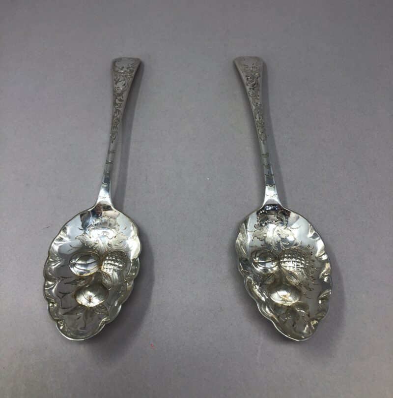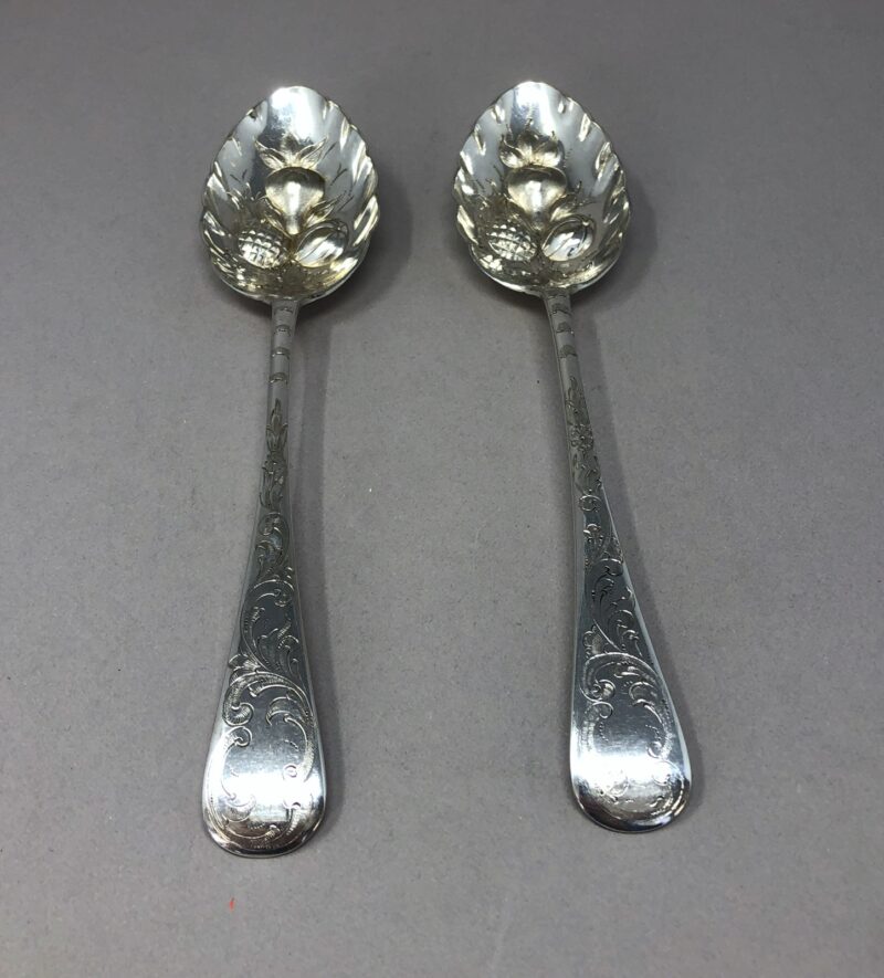 A lovely pair of Barker Brothers silver plated berry spoons with a pointed tip to really aid in scooping berries. Each spoon also has a beautiful and unique repousseé  fruit pattern within the bowls, as well as an elegant engraved pattern on their handles.