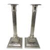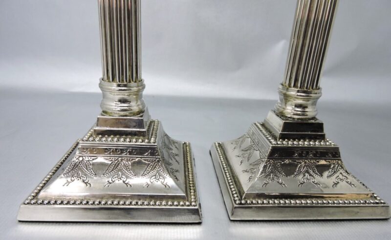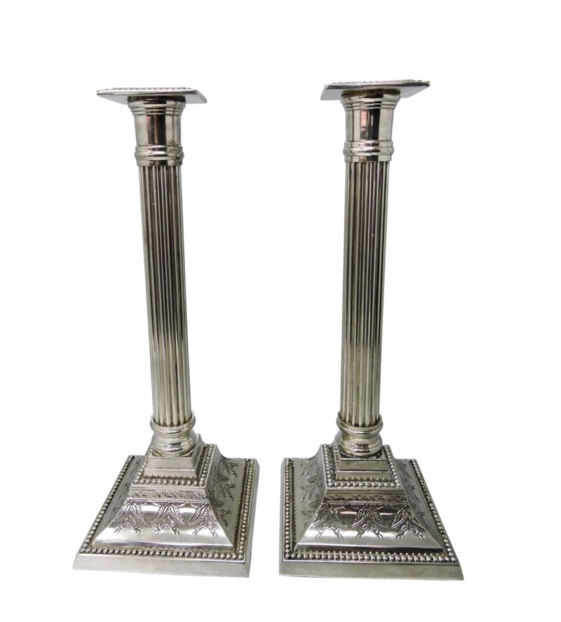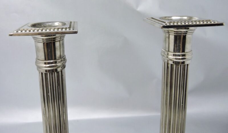 Pair of Silver-Plated Column Candlesticks, Etched Decoration and Beading