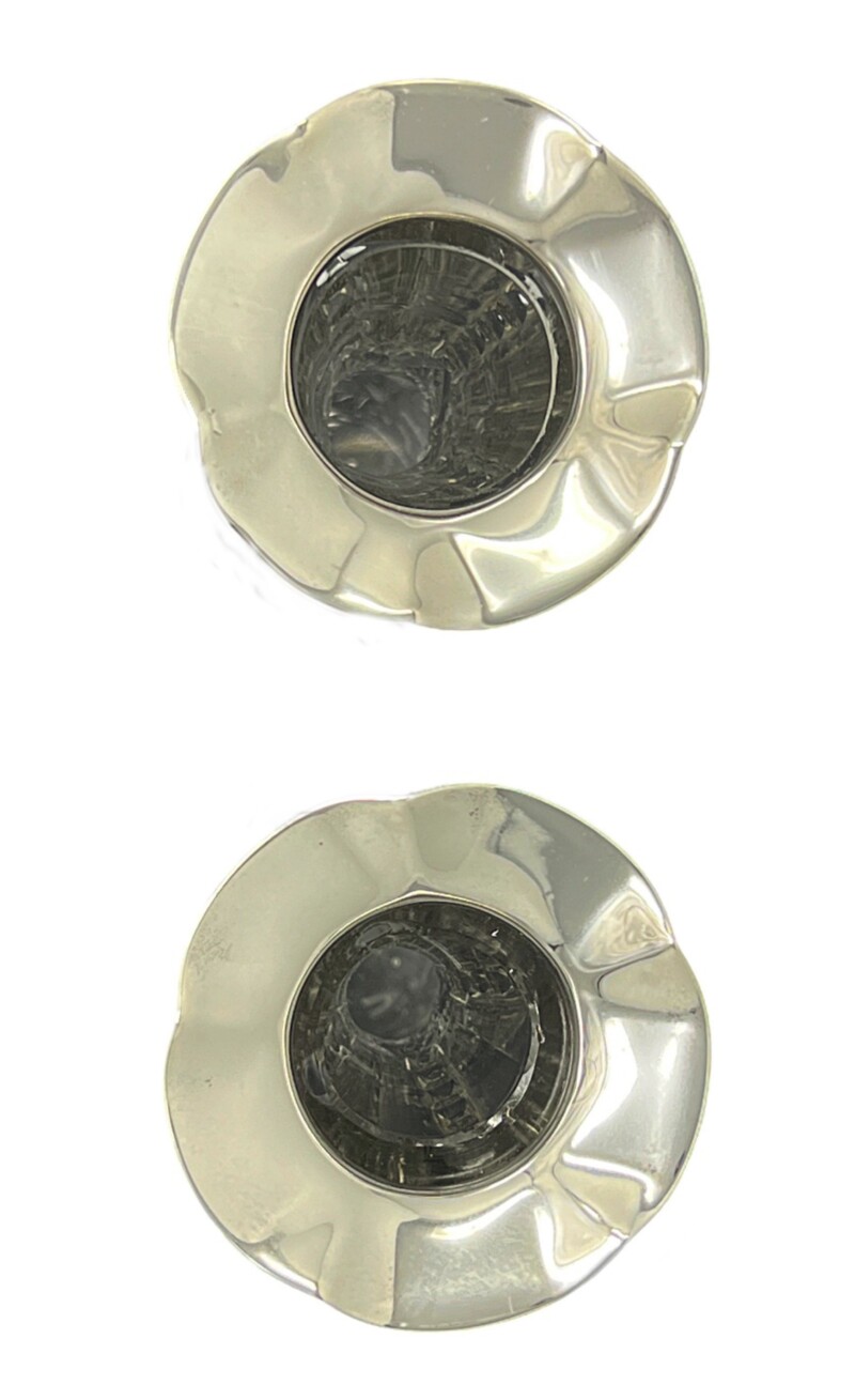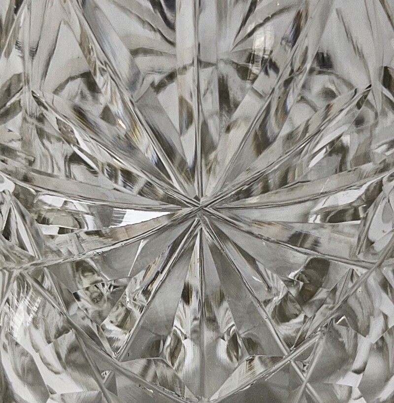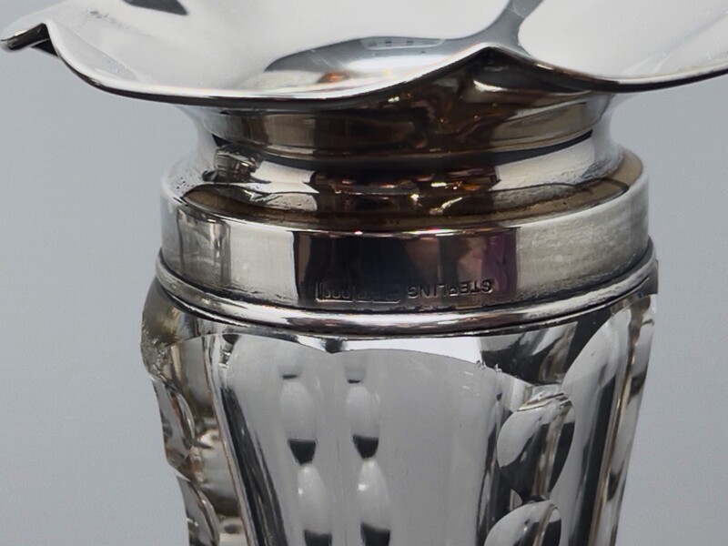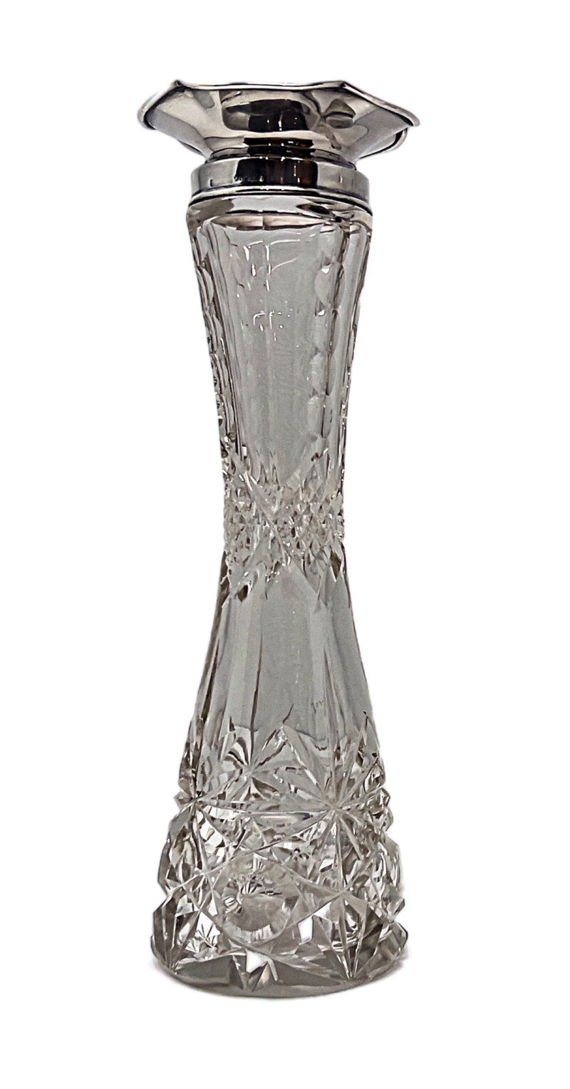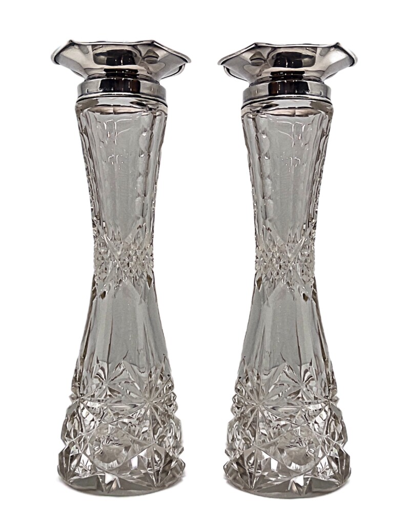 This pair of tall and elegantly shaped crystal vases features a combination of design elements. The cut crystal vases are from the American Brilliant Period c1900 and are mounted with sterling silver collars marked “sterling .925”.  The glass is unsigned and one vase has two very small crystal fleabites, otherwise both are in excellent condition considering their age.  A real treat to find a pair that are dramatically  gorgeous, both decorative and useful.