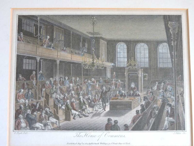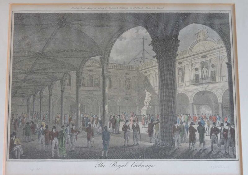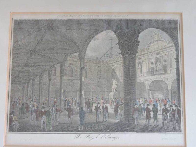 Pair of Hand Coloured Prints – House of Commons & Royal Exchange. Published by Richard Phillips, 1804.