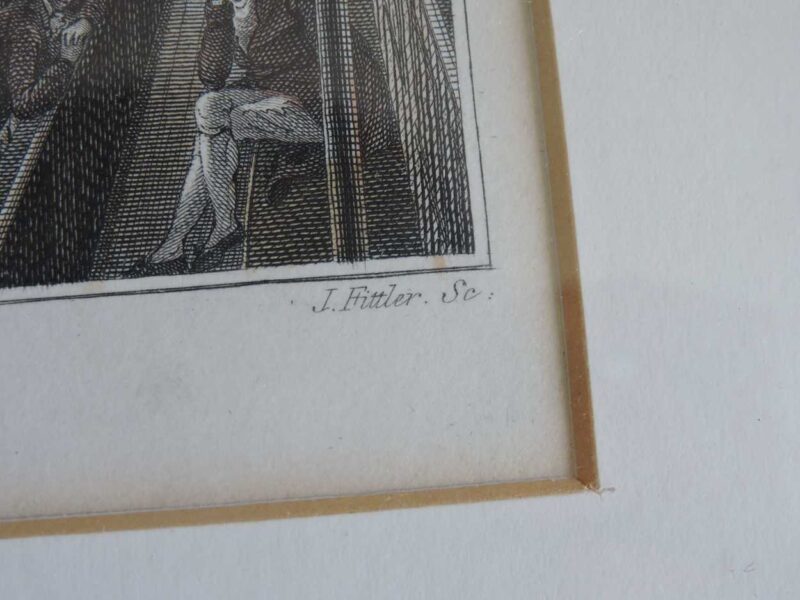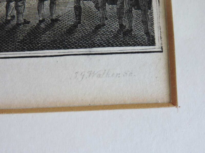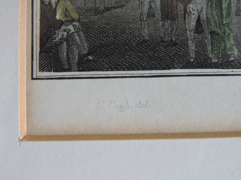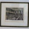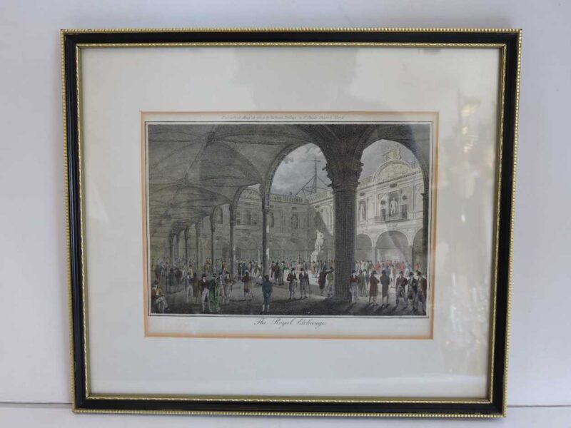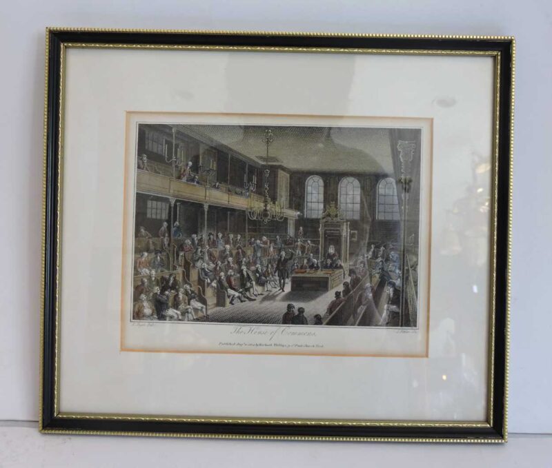 A pair of hand coloured prints with titles, ‘House of Commons’ and ‘Royal Exchange’, published in August 1804 by Richard Phillips, 71 Saint Pauls Church Yard. Each print is beautifully printed from the press, and contains a descriptive illustration depicting a narrative of everyday people in from the ‘House of Commons’ to the ‘Royal Exchange in England’. It features colour and black ink washes of : red, green, brown and blue. The line work is quite impressive and detailed, with a great direction of space and light to captures an experience. Each print had a mat border and lies under a sheet of glass with a dark wooden frame.