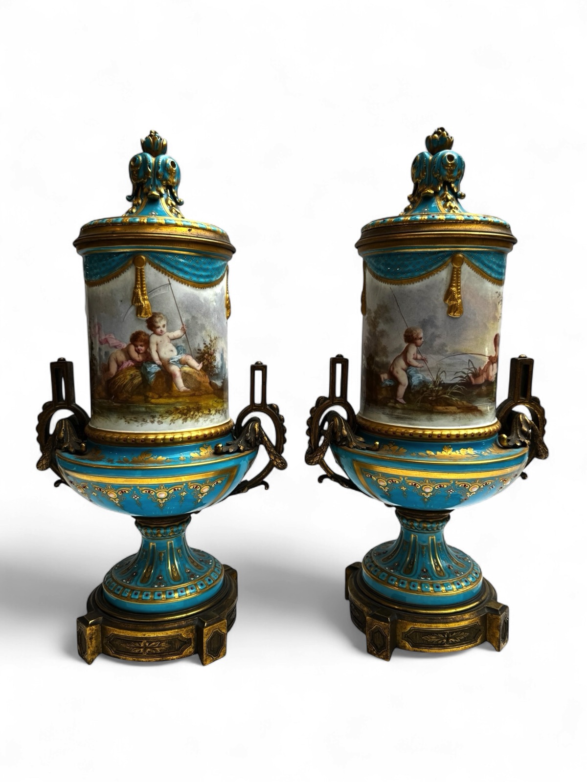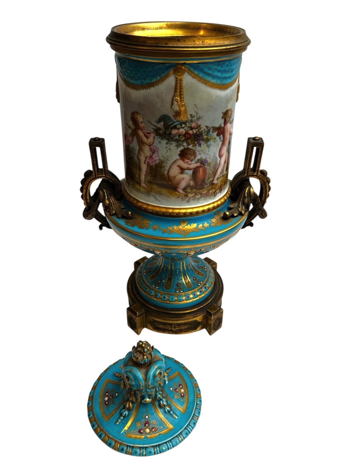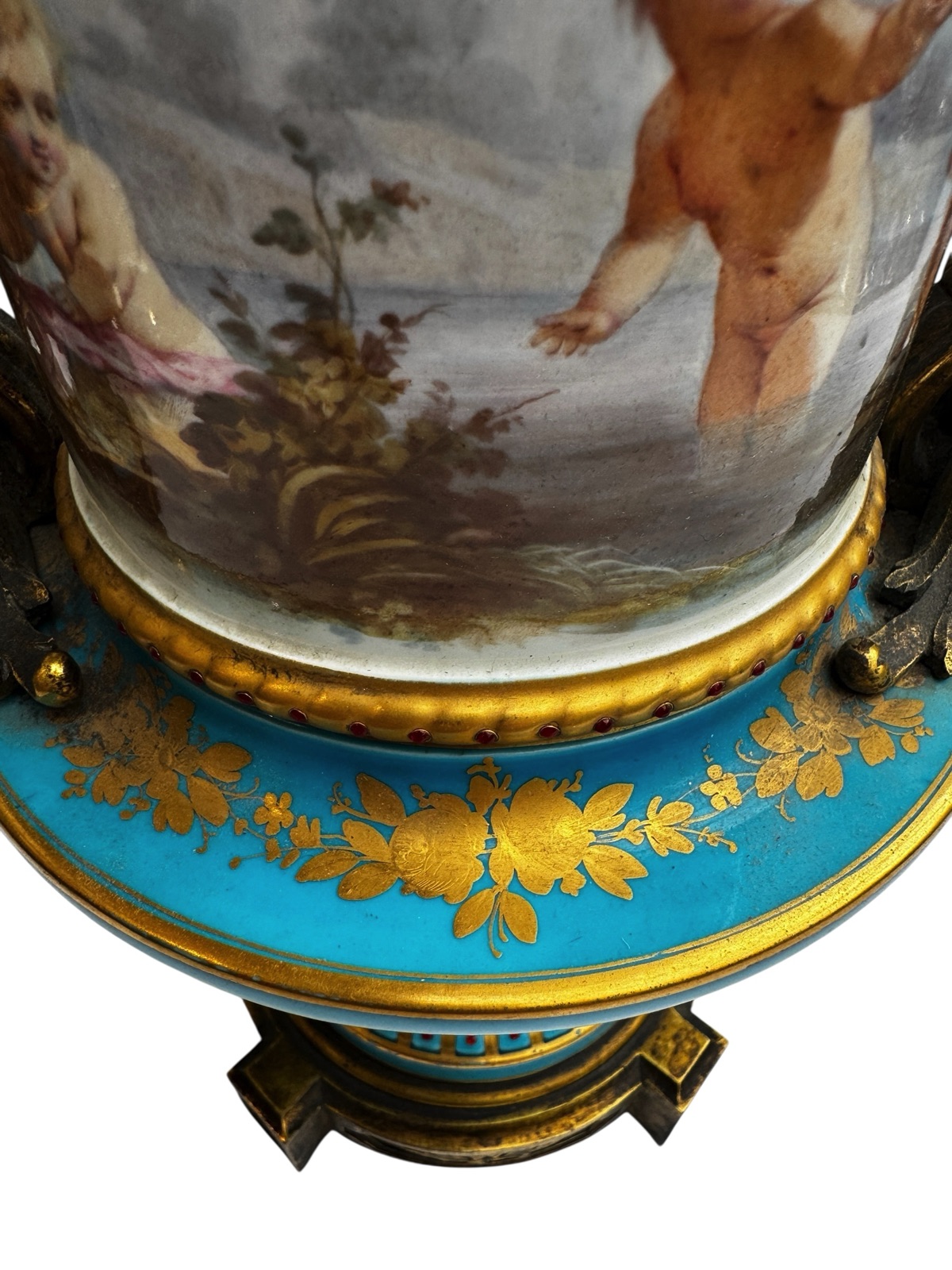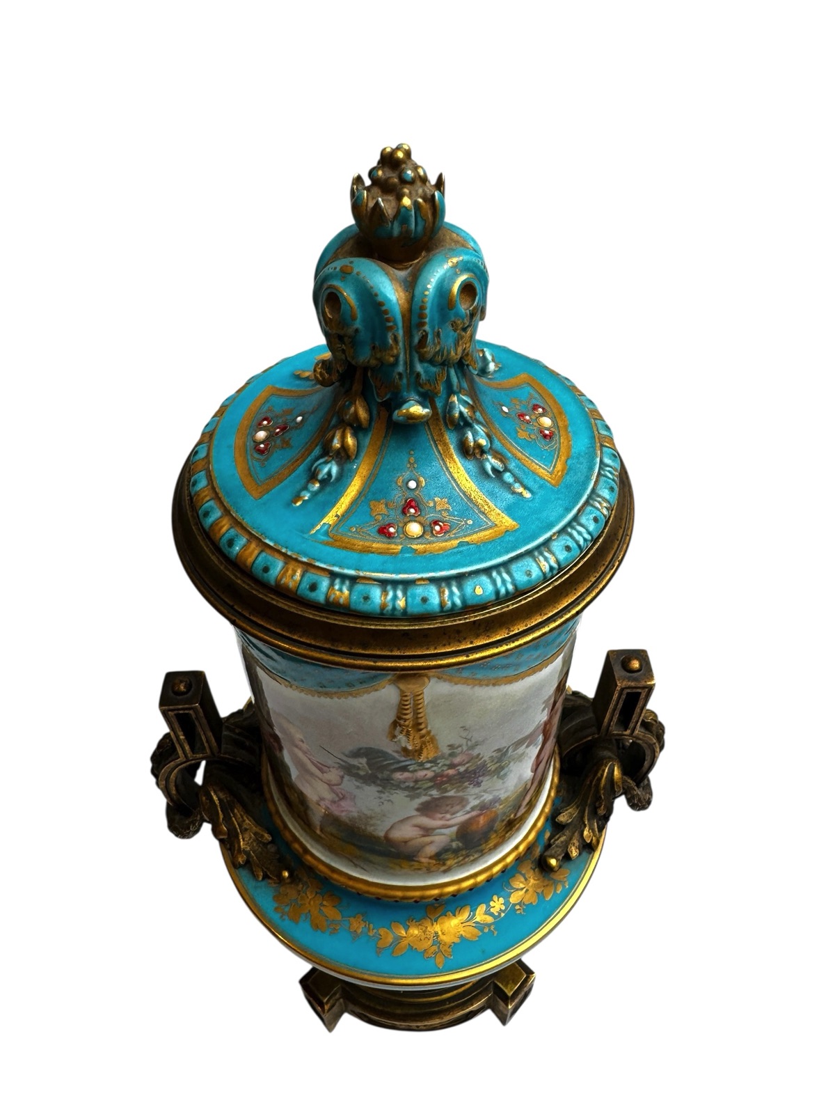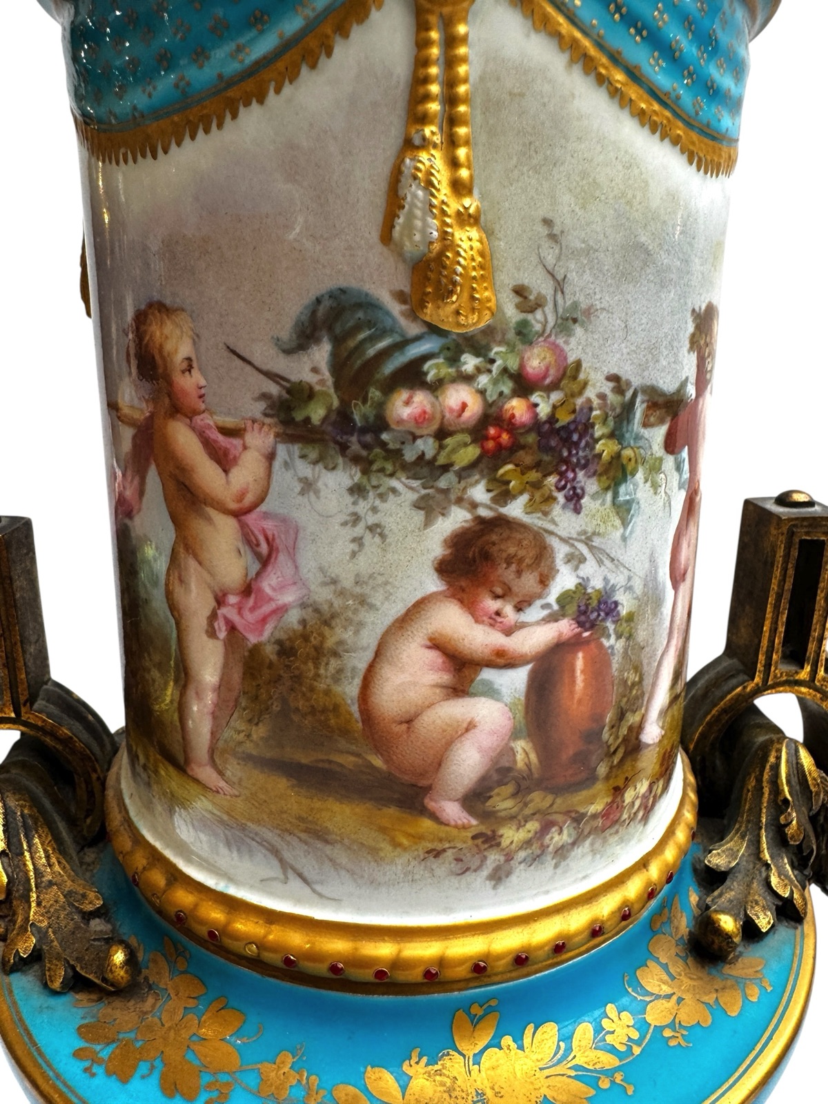Very fine pair of French “bleu celeste” ground, hand painted and lidded porcelain urns in the manner of Sèvres, with gilt bronze mounts in the Louis XVI taste with scroll and floral forms that embraced Neoclassicism and  inspired by Greek & Roman art. Central bands of hand painted  “puttis in landscape” scenes trimmed in gold gilt are supported by several layers of the “turquoise” jeweled porcelain patterning, that ornaments the entire lower urn to the circular bronze gilt base. The removable lids just add to the luxury in presentation with the porcelain in high relief foliate hand painted gilt and jewelled decoration.