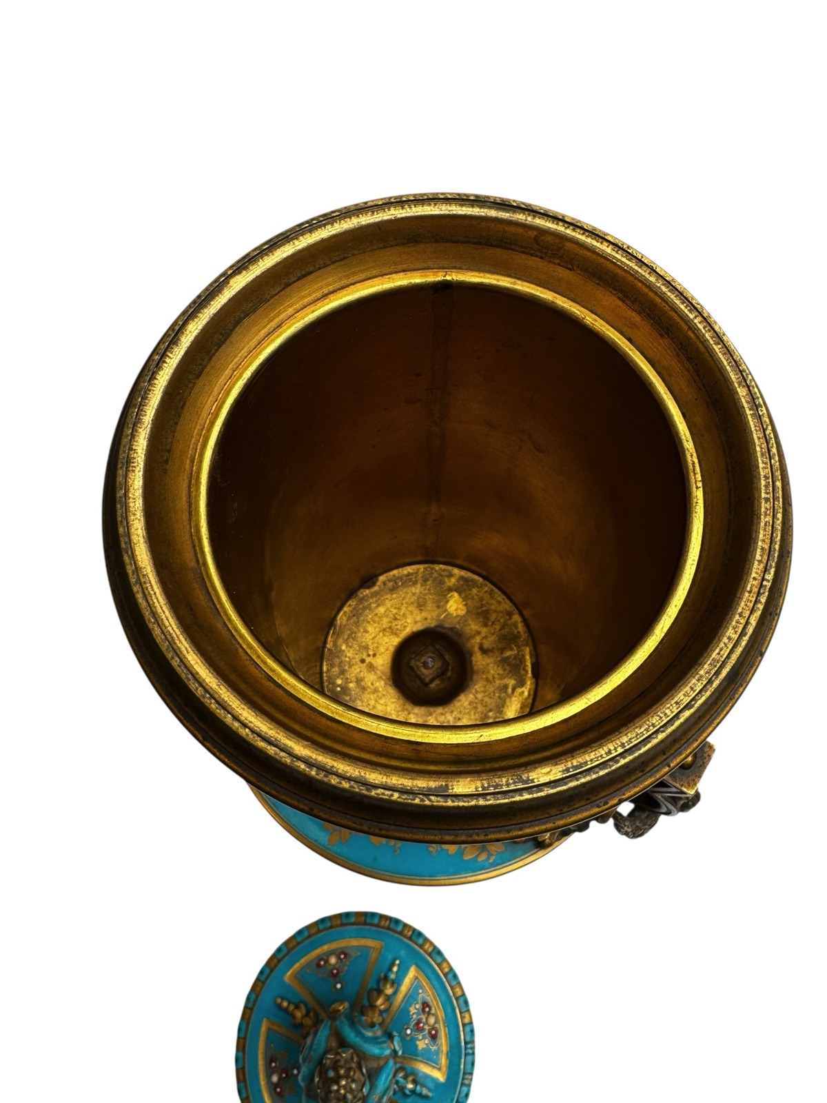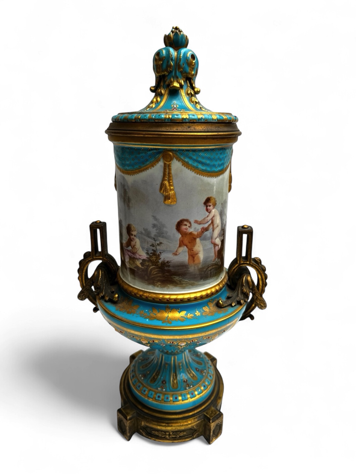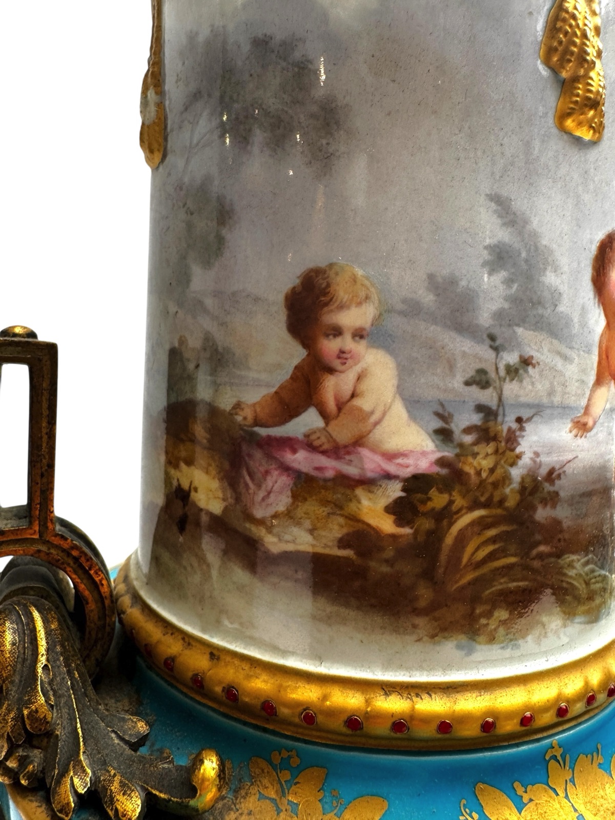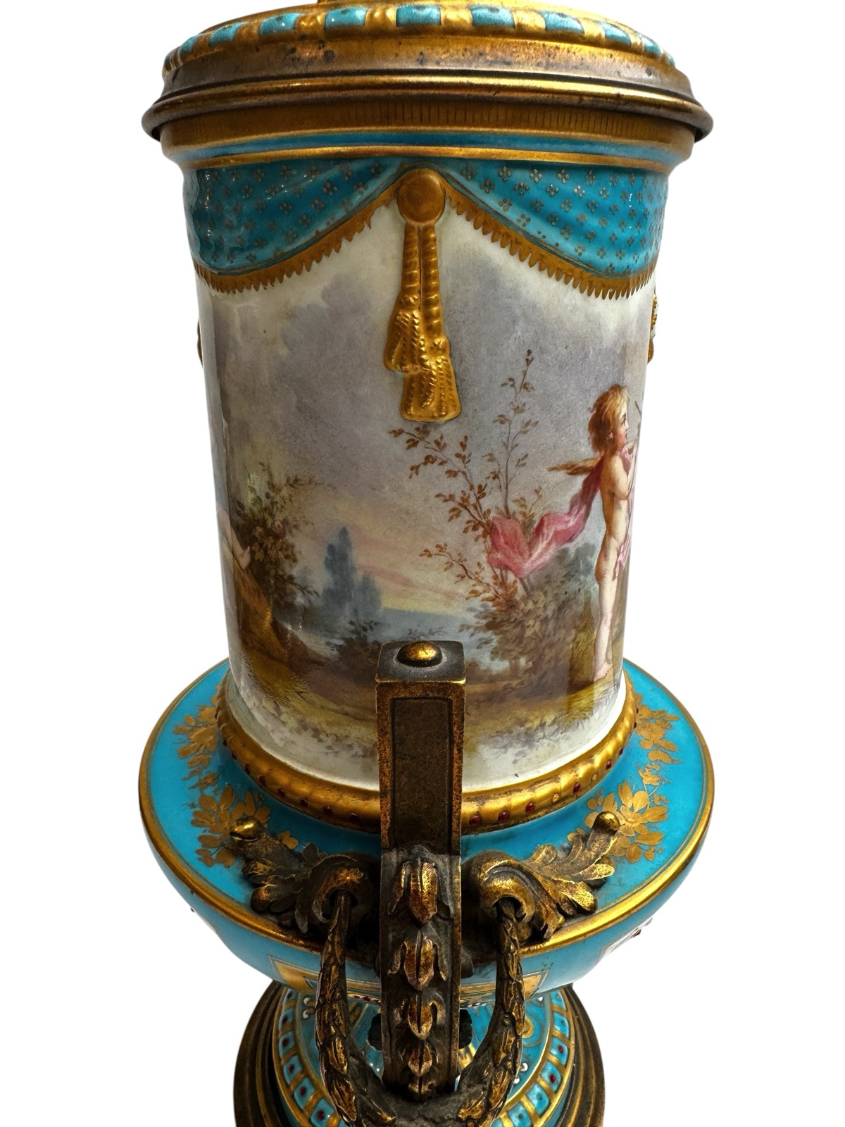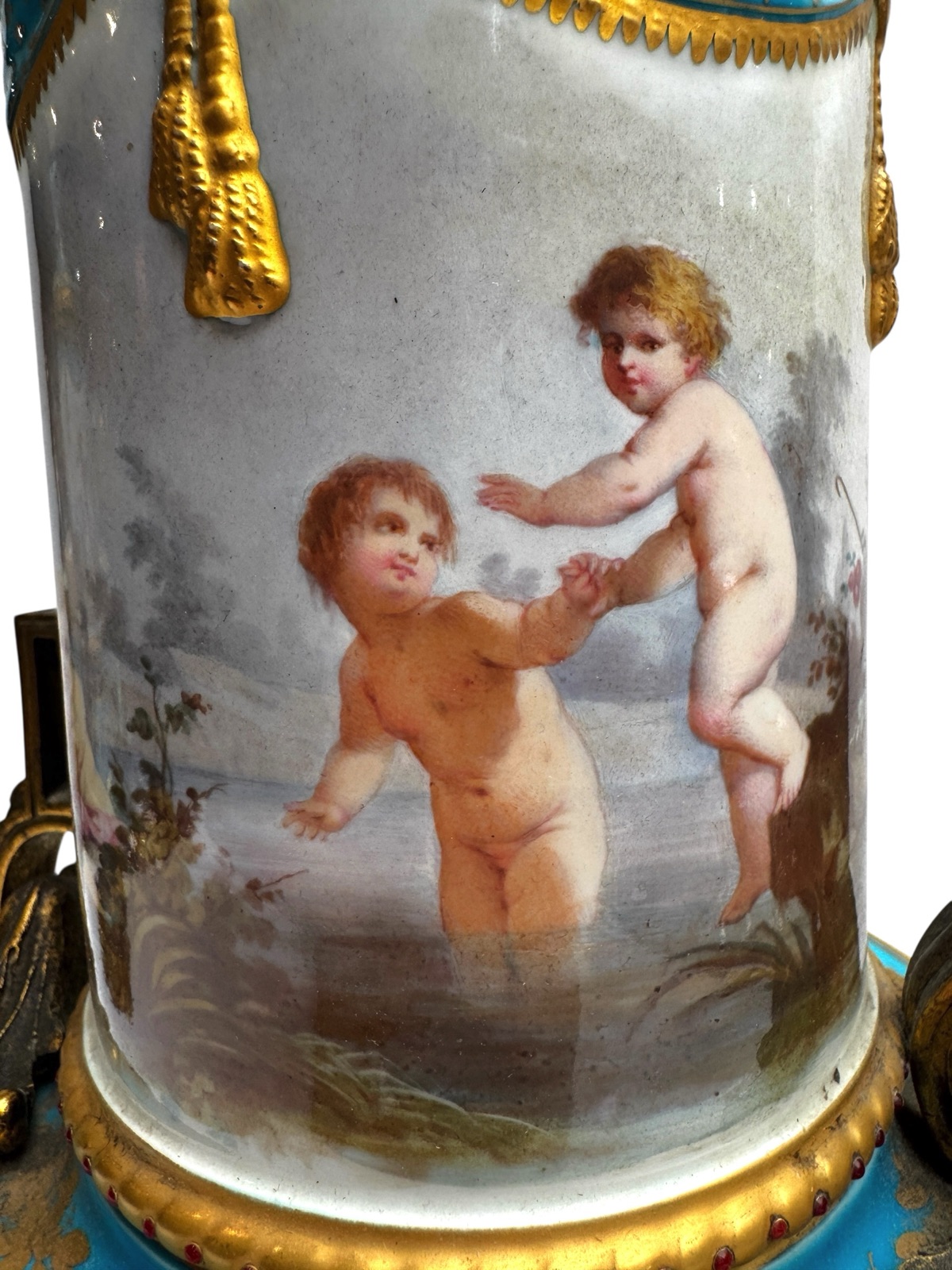 Very fine pair of French “bleu celeste” ground, hand painted and lidded porcelain urns in the manner of Sèvres, with gilt bronze mounts in the Louis XVI taste with scroll and floral forms that embraced Neoclassicism and  inspired by Greek & Roman art. Central bands of hand painted  “puttis in landscape” scenes trimmed in gold gilt are supported by several layers of the “turquoise” jeweled porcelain patterning, that ornaments the entire lower urn to the circular bronze gilt base. The removable lids just add to the luxury in presentation with the porcelain in high relief foliate hand painted gilt and jewelled decoration.