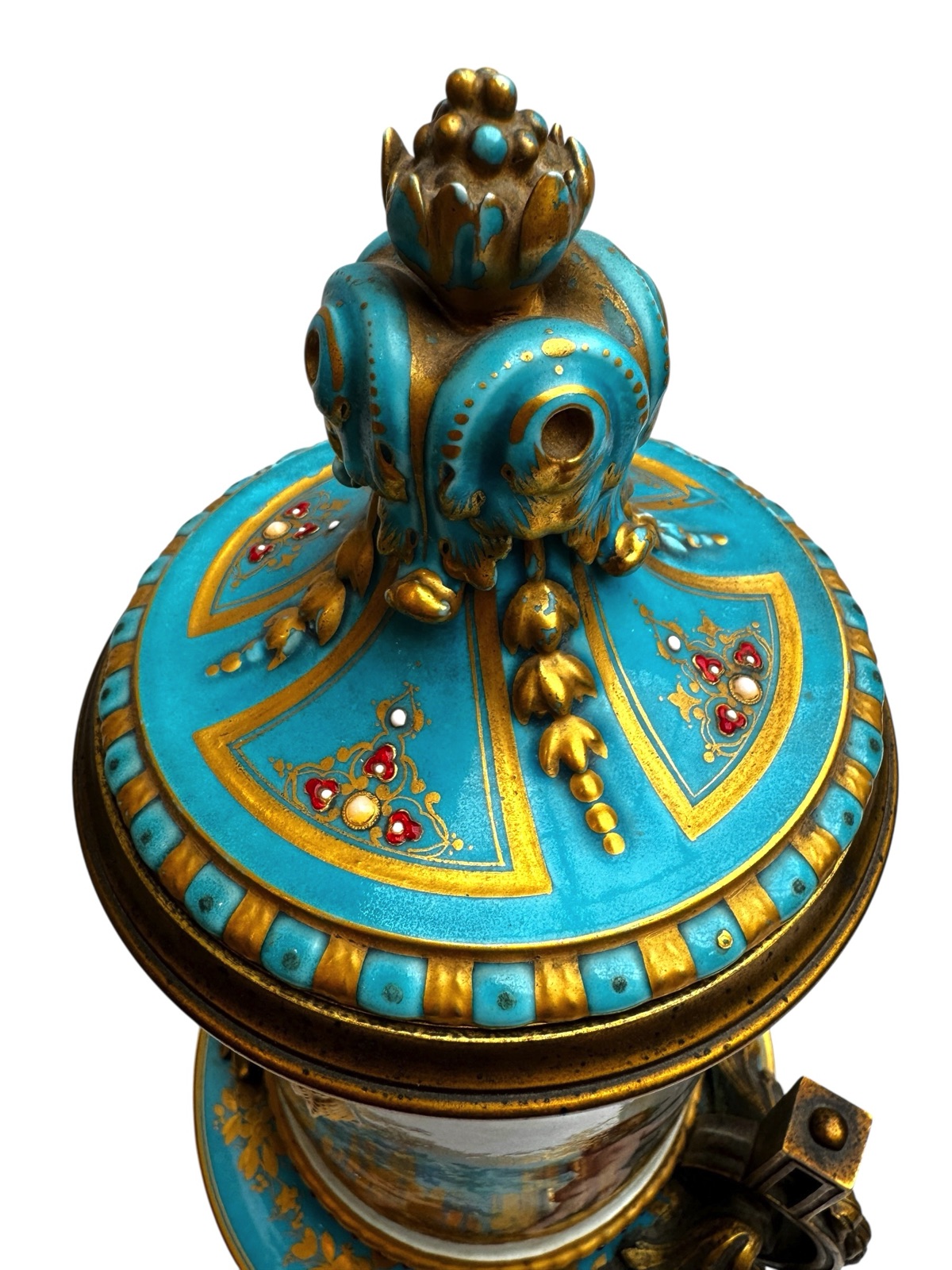 Palatial French Sevres Style Pair of “Bleu Celeste” Porcelain Lidded Urns, Jewelled & Hand Painted, Circa 1860