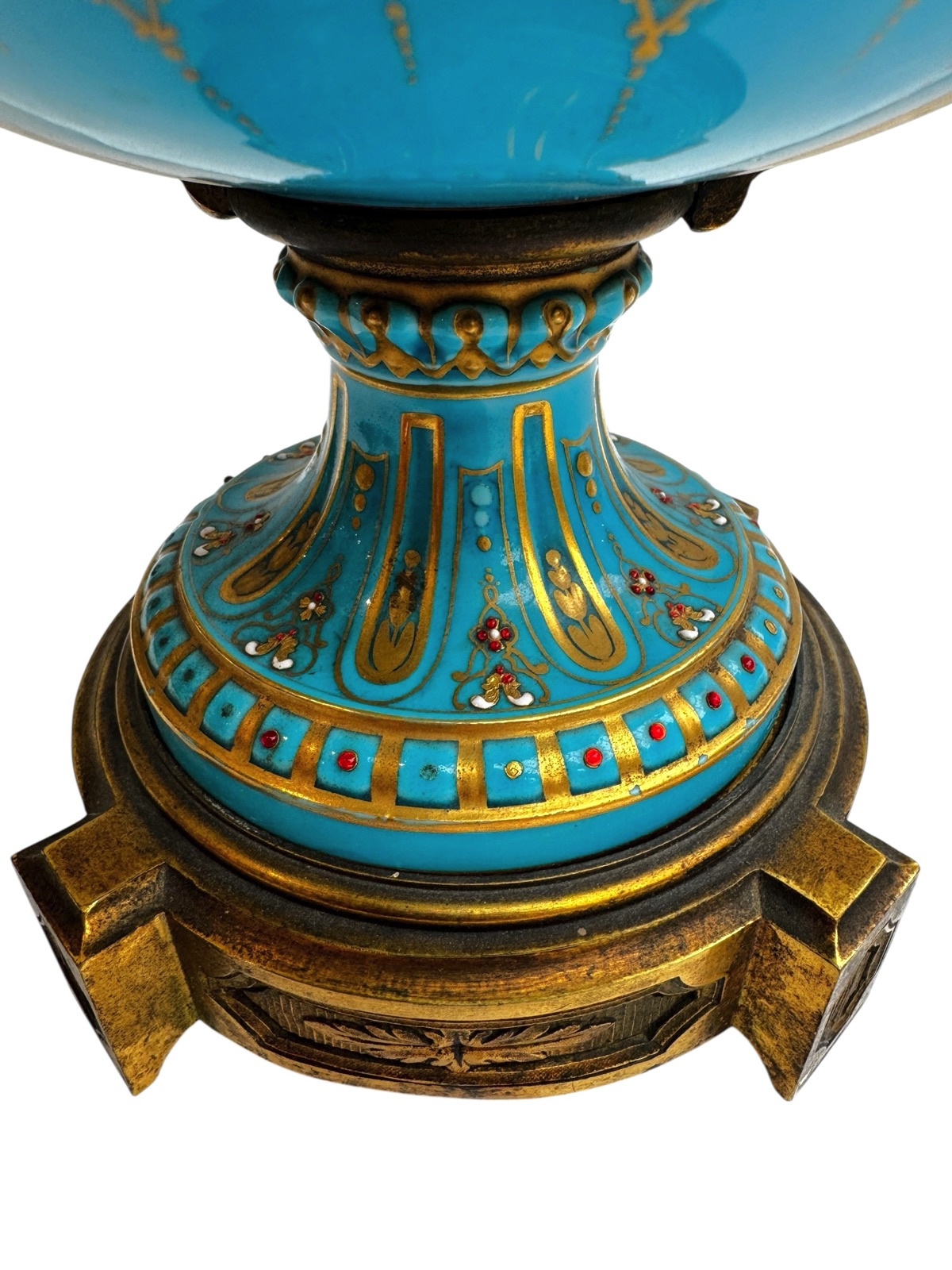 This stately and palatial pair of “blue celeste” Sevres style urns are a luxurious addition to any grand setting.
