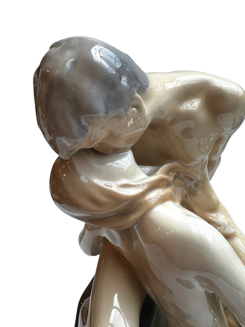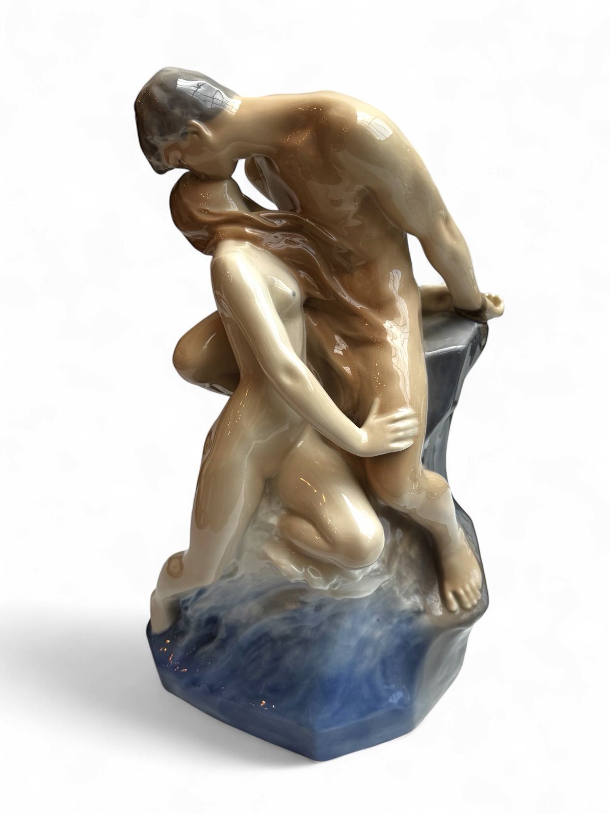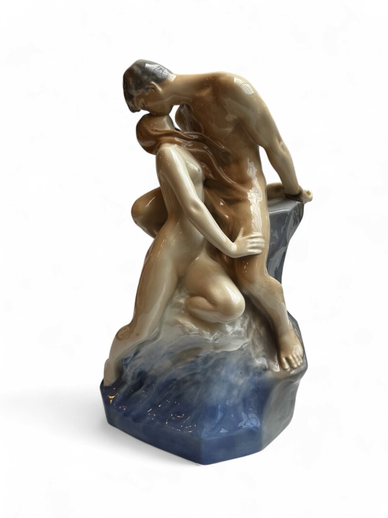Figurines, PorcelainsFrom Royal Copenhagen, circa mid 20th Century, a large and very dynamic porcelain sculpture of “Prometheus & A Sea Nymph”. It was originally designed by Theodor Lundberg (1852-1926), then produced by Royal Copenhagen. Also known as “Couple Kissing By The Sea”, “TheKiss”, “Wave and Rock” and “Man and Woman by the Sea”.