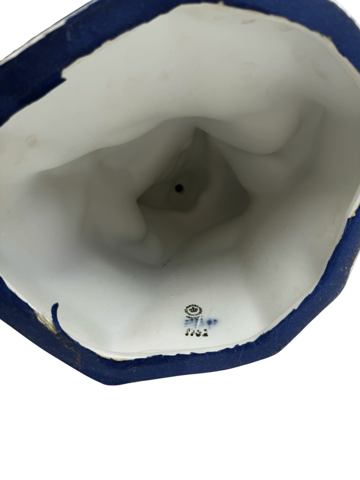 Originally designed in 1897 by renowned sculptor Theodor Lundberg, the sculpture captures the raw passion and drama of nature and human emotion. Delicate modeling of the human figures in naturalistic flesh tones contrasts the deep cobalt of the water creating a rich and dramatic “visual story”. This iconic sculpture stands as one of Royal Copenhagen’s most emotionally charged and technically accomplished creations. An extraordinary and museum-worthy showpiece that embodies the passion, power, and elegance of turn-of-the-century Danish porcelain artistry. The base is marked with the Royal Copenhagen underglaze green crown and triple wave hallmark, along with the model number.