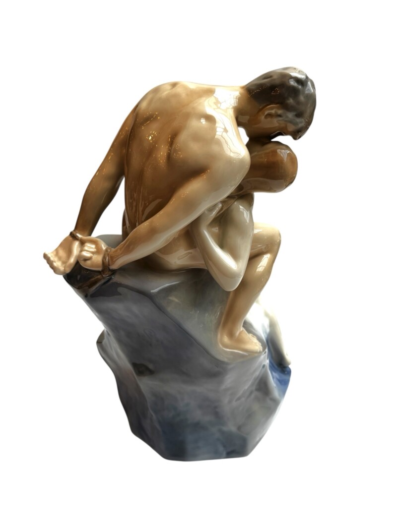 The sculpture depicts in Greek mythology “Prometheus” who is responsible for creating or aiding humanity in its earliest days. He defied the Olympian gods by taking fire from them and giving it to humanity in the form of technology, knowledge and, more generally, civilization. The punishment of Prometheus for stealing fire from Olympus and giving it to humans is a subject of both ancient and modern culture. Zeus, king of the Olympian gods, condemned Prometheus to eternal torment for his transgression. Prometheus was bound to a rock with his arms behind his back. This is the subject of this porcelain group where a nymph maiden rises from the waves to kiss the young man, Promethius who was eventually freed by the hero Heracles.