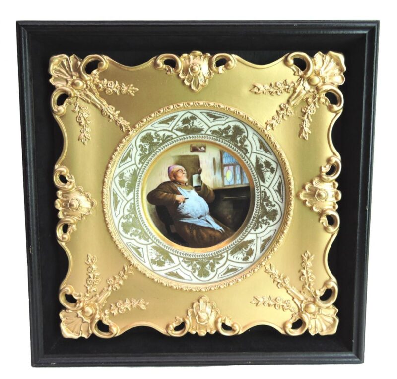 A German / Austrian porcelain plate with raised gilded border and a scene of a Friar or Monk drinking a stein of beer.  The scene is a transfer, but the raised heavy gilding is hand done.  The plate is framed in a gold wood interior frame and then a large black wooden shadowbox frame.
