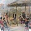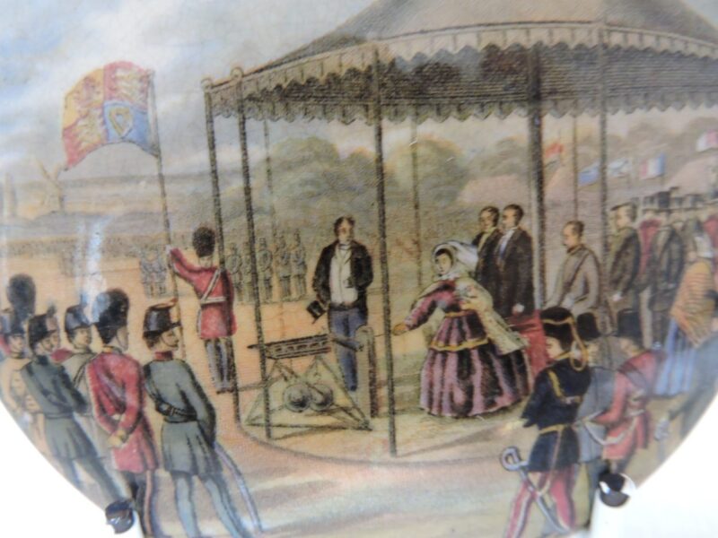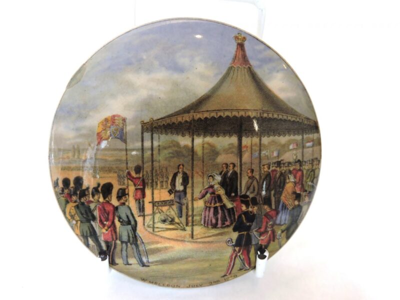 A lovely Pratt Ware porcelain lid, unframed, entitled “Wimbledon July 2nd, 1820” and showing a number of military and civilian figures near and in a marquee. The lid is 4 inches in diameter with strong colours and details. There are some small chips on the underside of the lid.