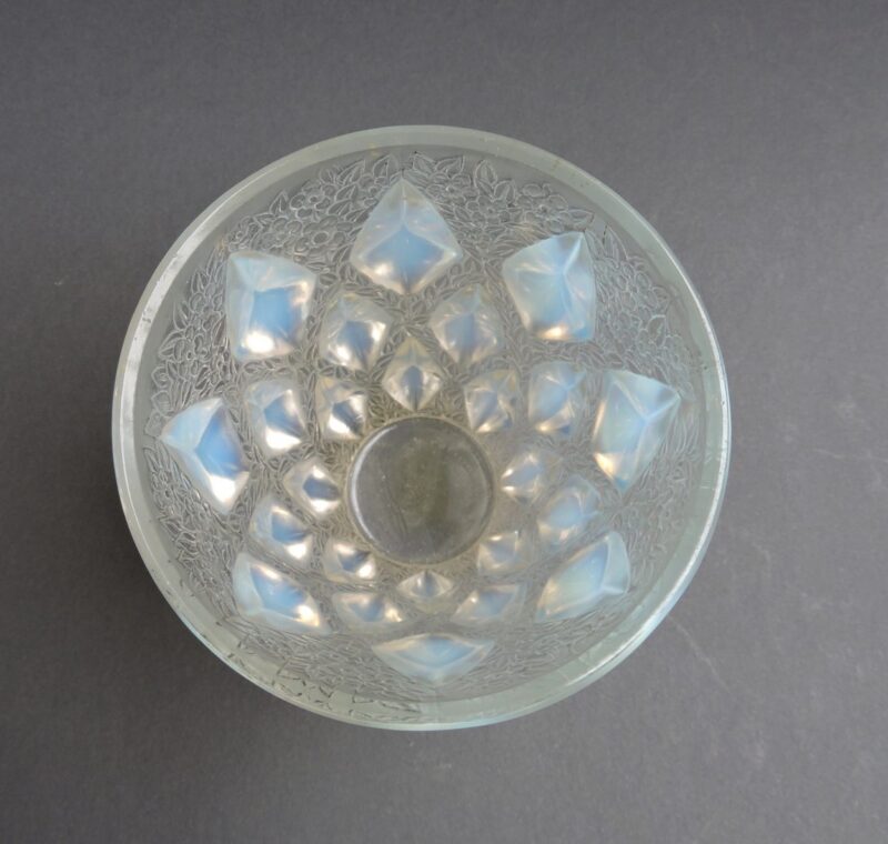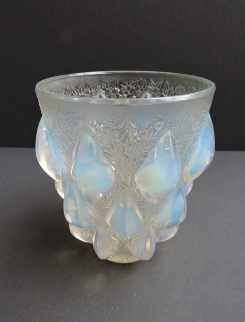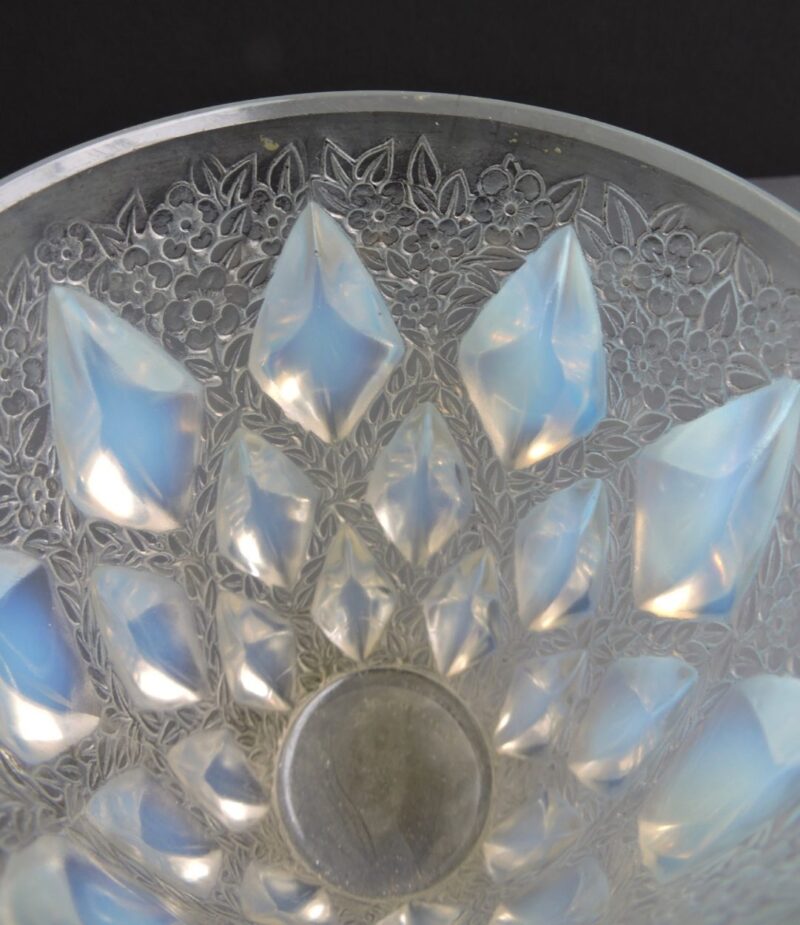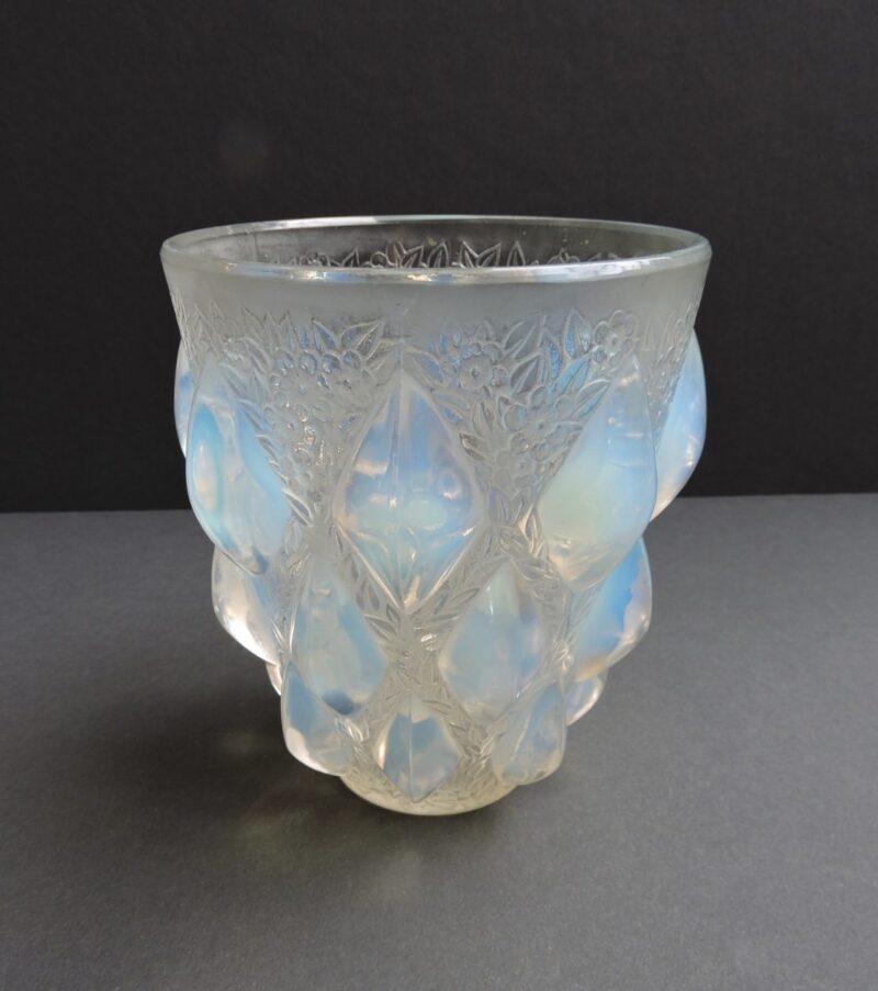 Signed R. Lalique, France on the bottom – the vase was introduced in 1927 and discontinued in 1932. Of course the opalescence makes this rarer as they stopped making opalescent pieces as it was a more difficult process and partly because the the poisonous nature of some of the ingredients used to make Opalescent glass.