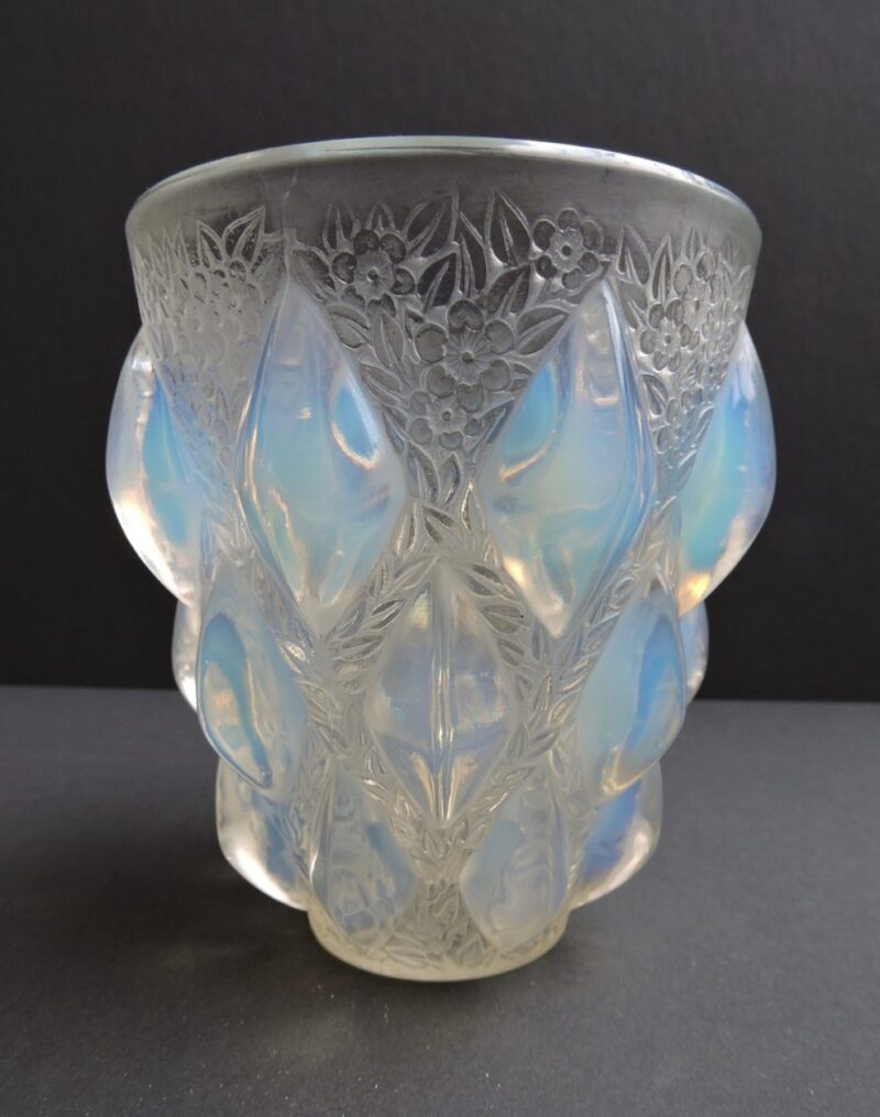 v** SOLD ARCHIVES **vA stunning Art Deco René Lalique vase titled “Rampillon” – decorated with in a relief floral background with blue & white opalescent geometric patterns spaced evenly throughout the body of the vase.