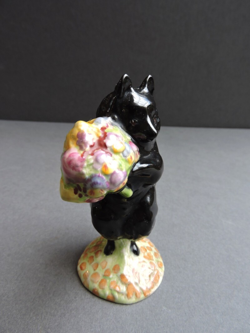 A rare and delightful Beswick England pottery figurine of Duchess, the black dog, holding a bouquet of colourful flowers. The figurine is part of the Beatrix Potter series. It was issued in 1955 and discontinued in 1967.