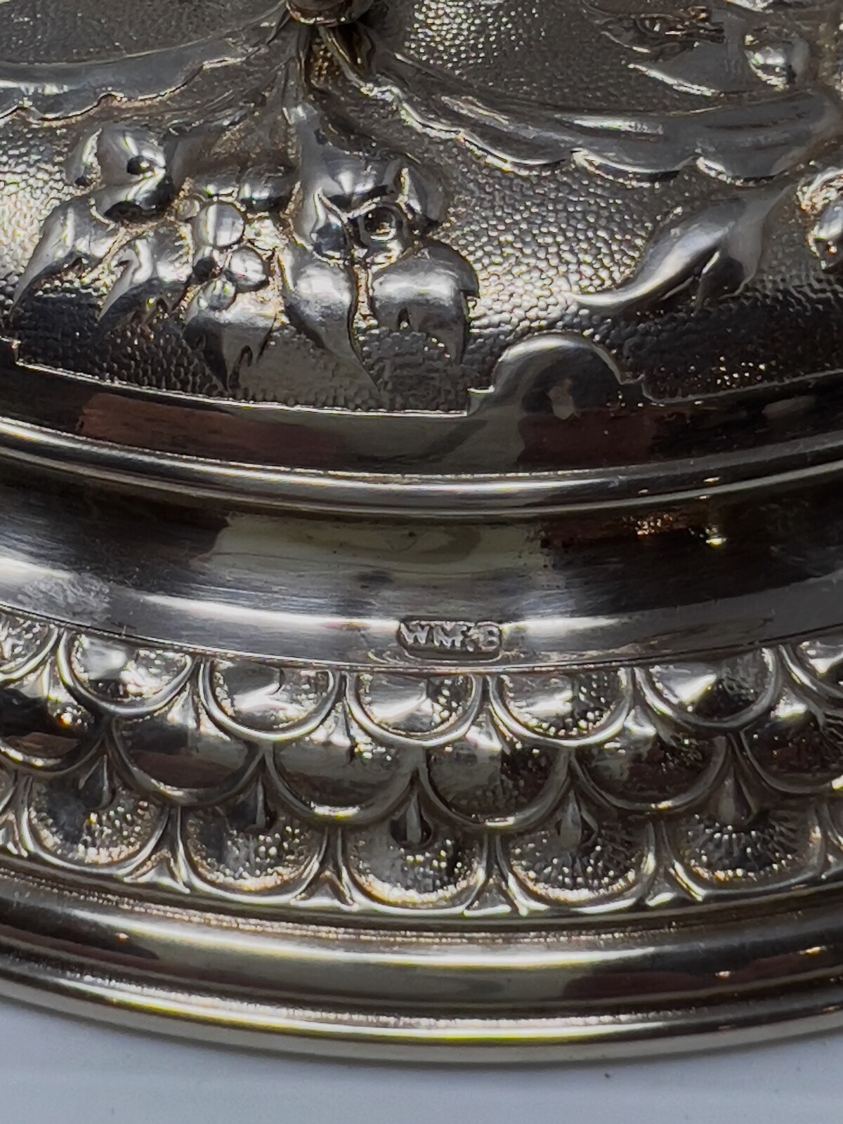 Silver HollowareWMF, the Württembergische Metallwarenfabrik, was a prominent German silverware manufacturer. In 1862 the firm gained international recognition when its silver-plated goods were awarded a medal at the Great London Exposition. Earlier pieces had a classical or historical style and by the late 1800s under the direction of sculptor and designer Albert Mayer, WMF began producing silver-plated items in the popular Art Nouveau style. The company also expanded its distribution internationally with locations in London, Vienna, and Warsaw.