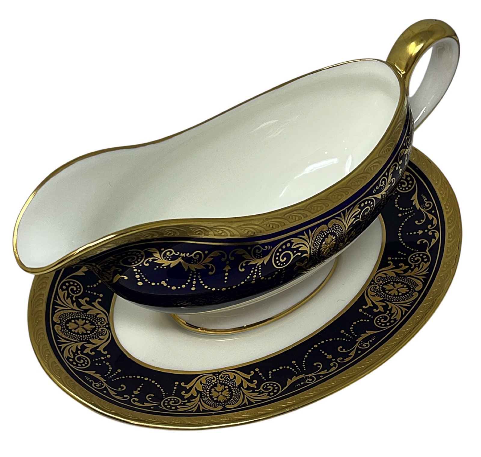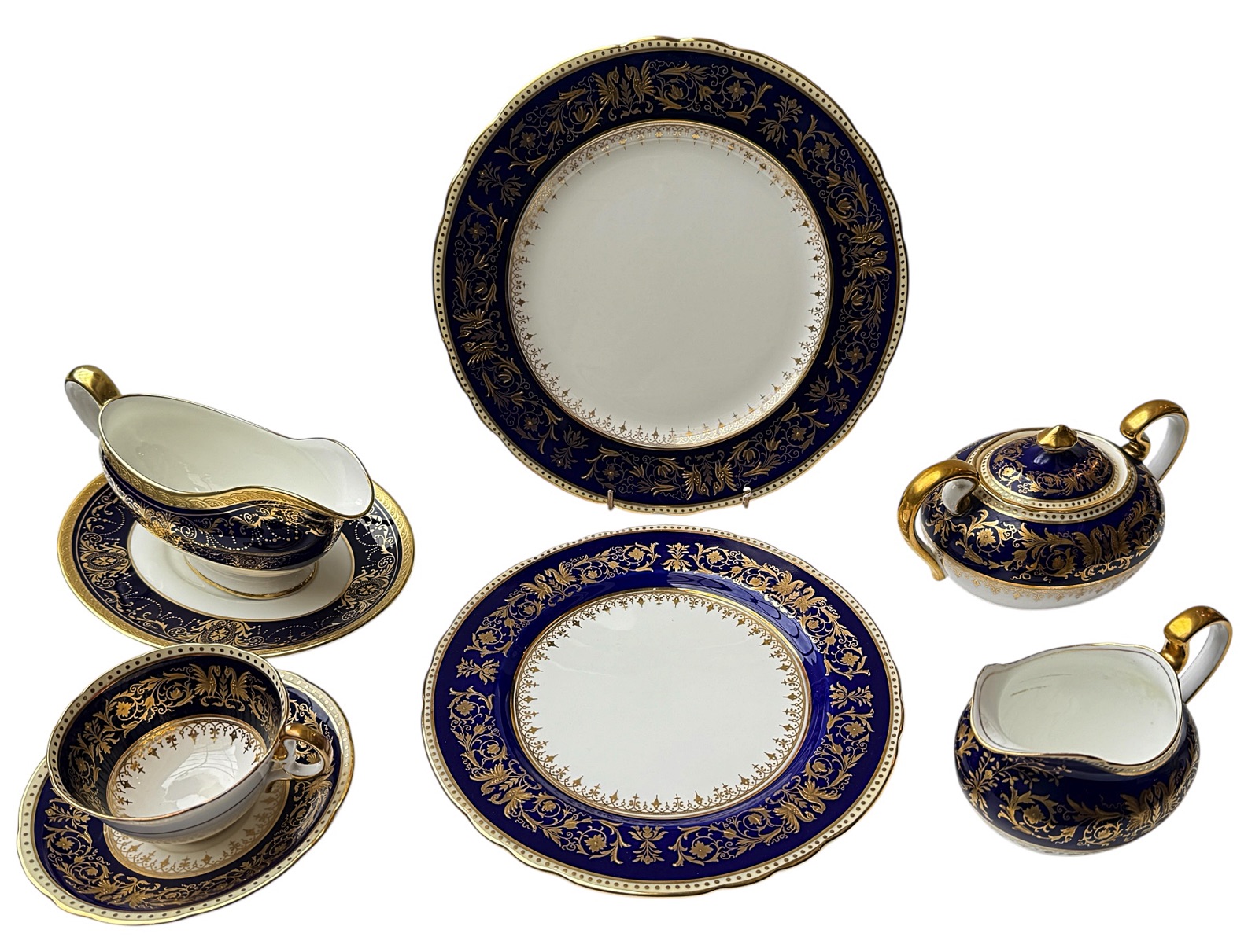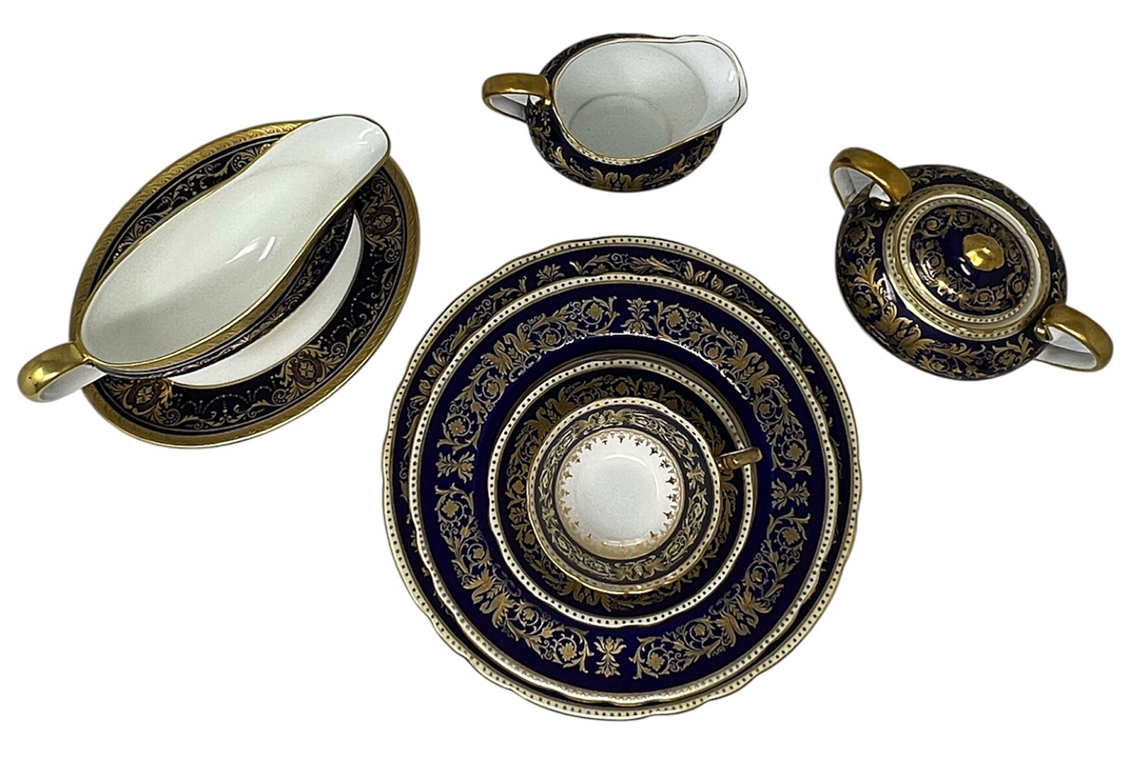 China PatternsLuxurious John Aynsley & Sons English bone china set in the “Seville Blue” pattern, #6874. Large 48 piece set includes: 16 Dinner Plates , 16 Luncheon Plates , 16 Teacups & 16 Saucers, 1 Covered Sugar, 1 Creamer. A complimentary Gravy Boat & Saucer which are a similar rare Aynsley pattern of cobalt blue with gold encrusted motifs, Marlborough Pattern#8357 . All in excellent condition, the rare “Seville Blue” pattern is stunning with the large rims of gold encrusted “winged dragon pairs”, scrolls and dot patterns set against a rich cobalt blue ground.