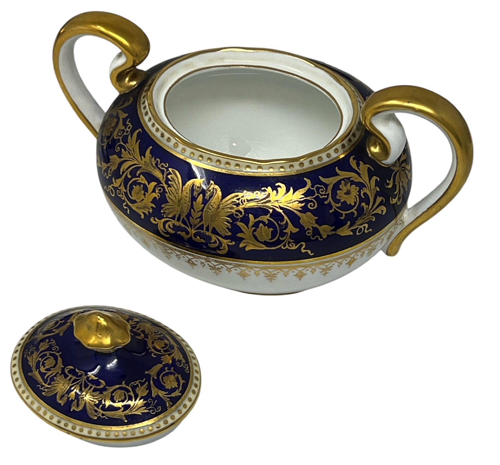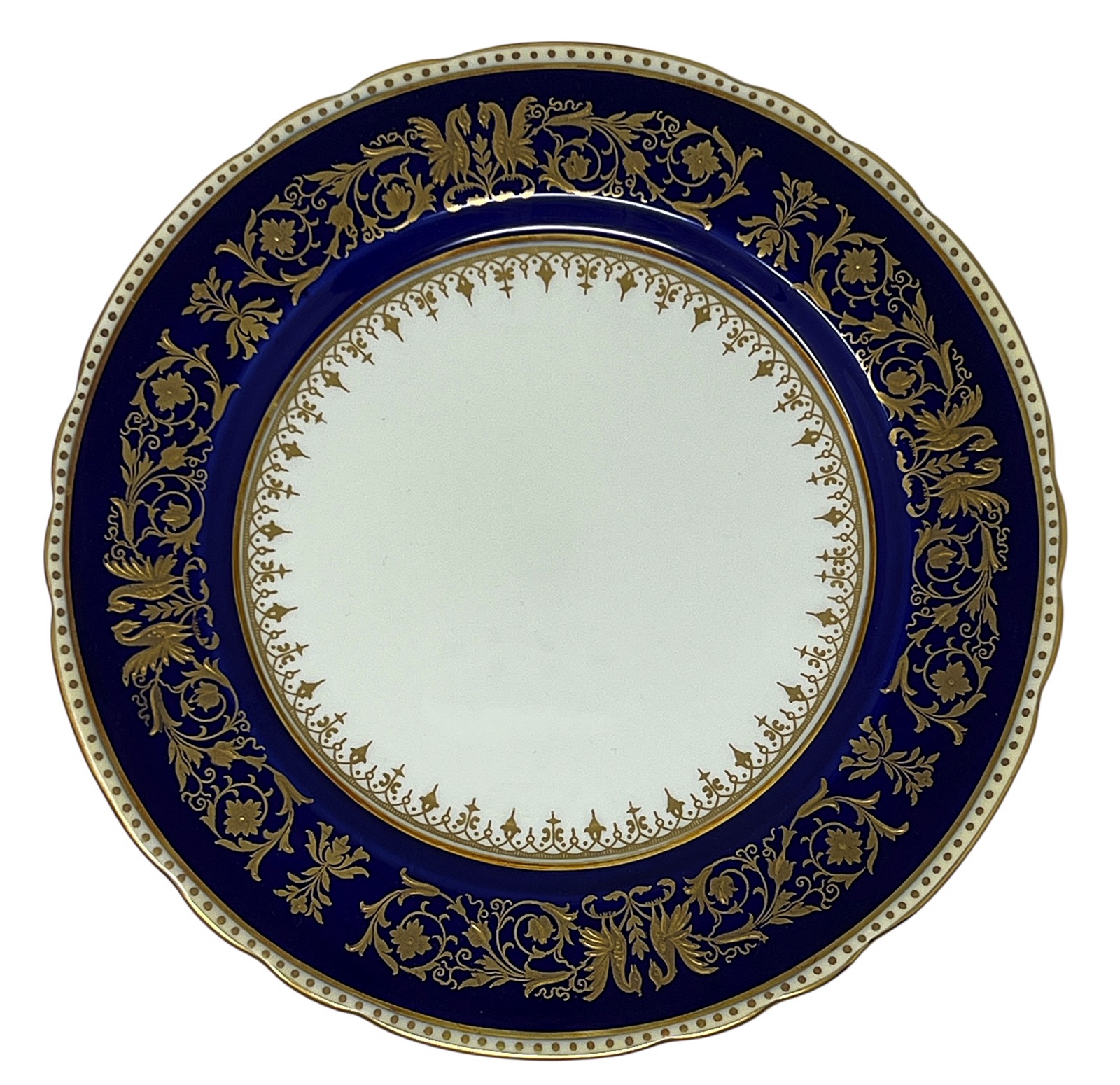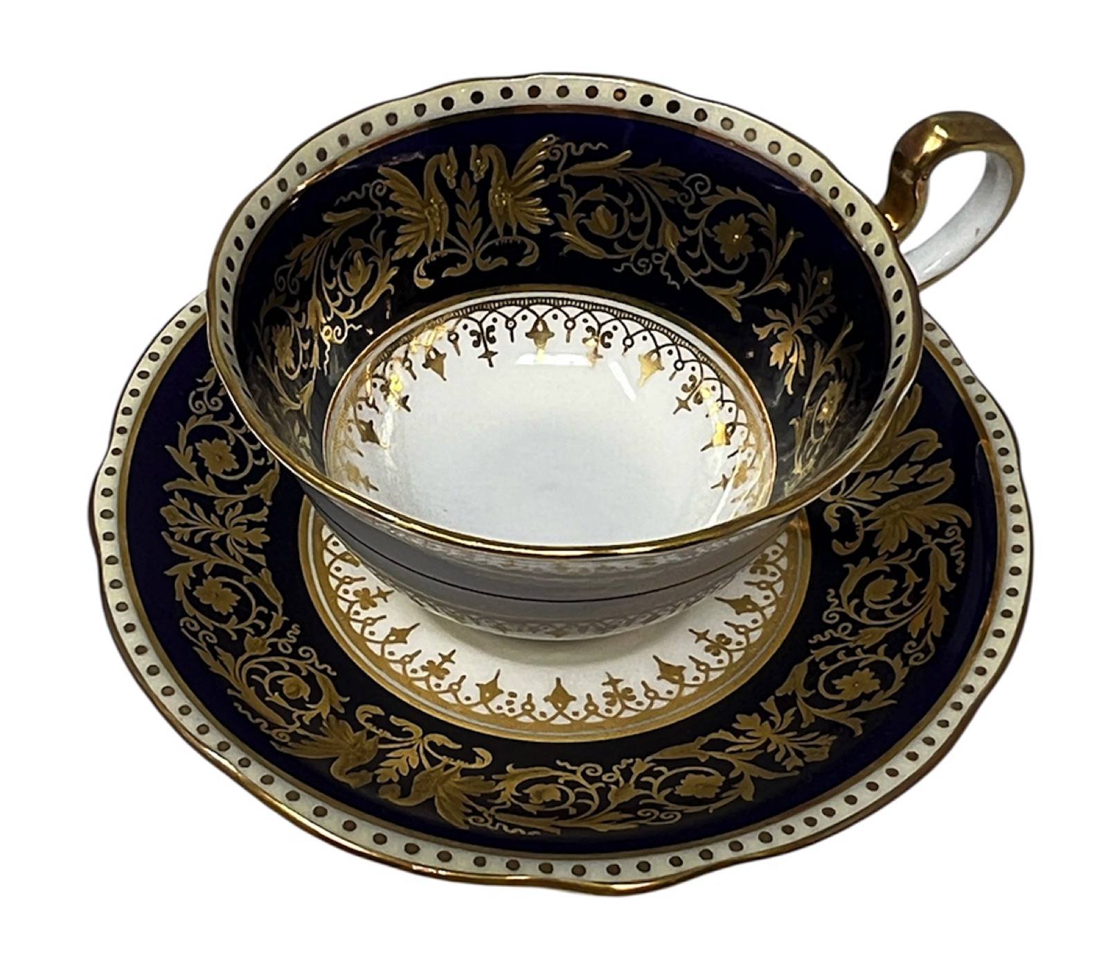 China PatternsLuxurious John Aynsley & Sons English bone china set in the “Seville Blue” pattern, #6874. Large 48 piece set includes: 16 Dinner Plates , 16 Luncheon Plates , 16 Teacups & 16 Saucers, 1 Covered Sugar, 1 Creamer. A complimentary Gravy Boat & Saucer which are a similar rare Aynsley pattern of cobalt blue with gold encrusted motifs, Marlborough Pattern#8357 . All in excellent condition, the rare “Seville Blue” pattern is stunning with the large rims of gold encrusted “winged dragon pairs”, scrolls and dot patterns set against a rich cobalt blue ground.