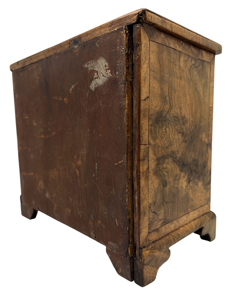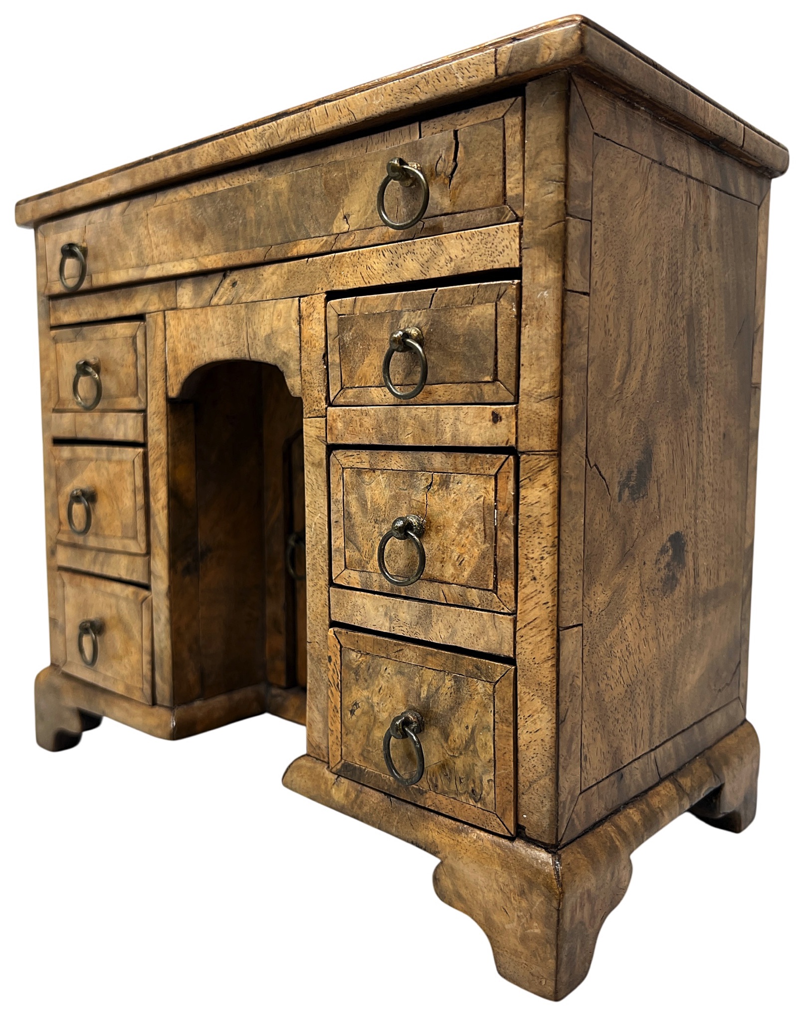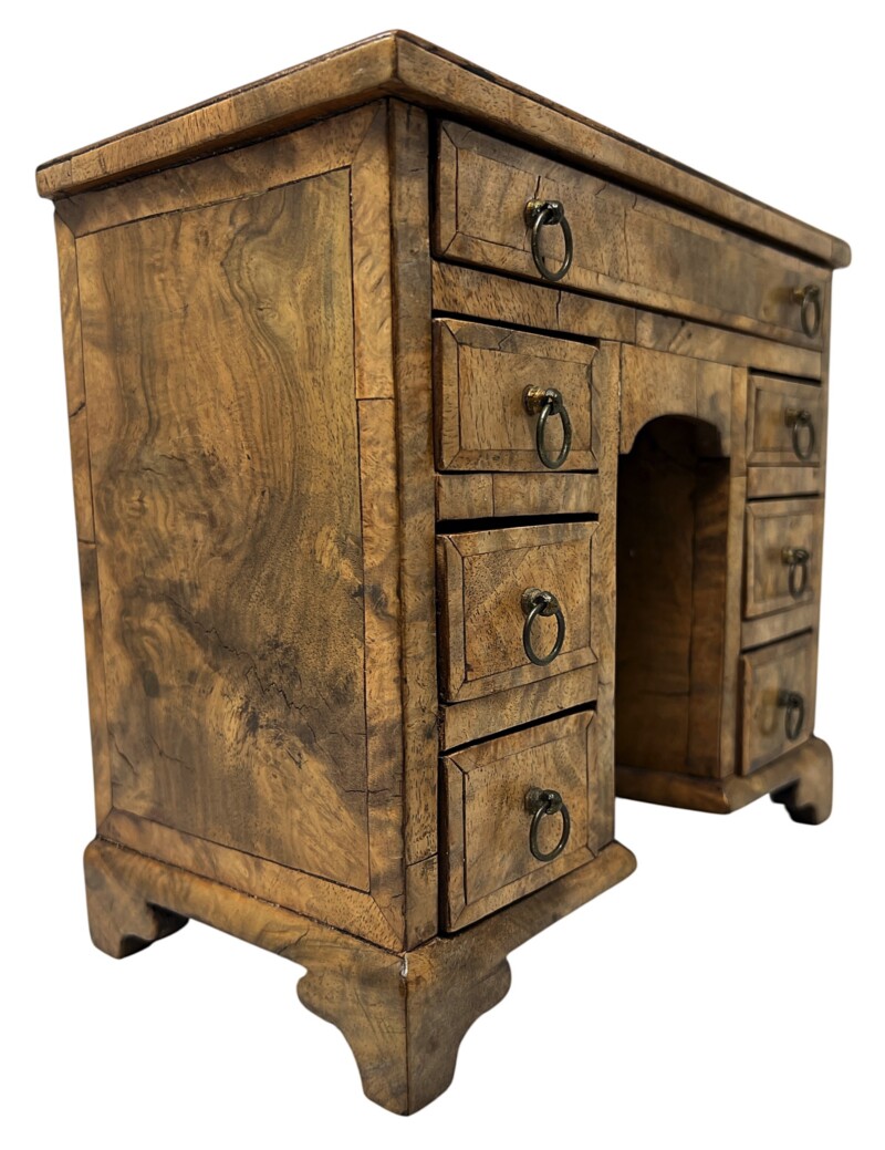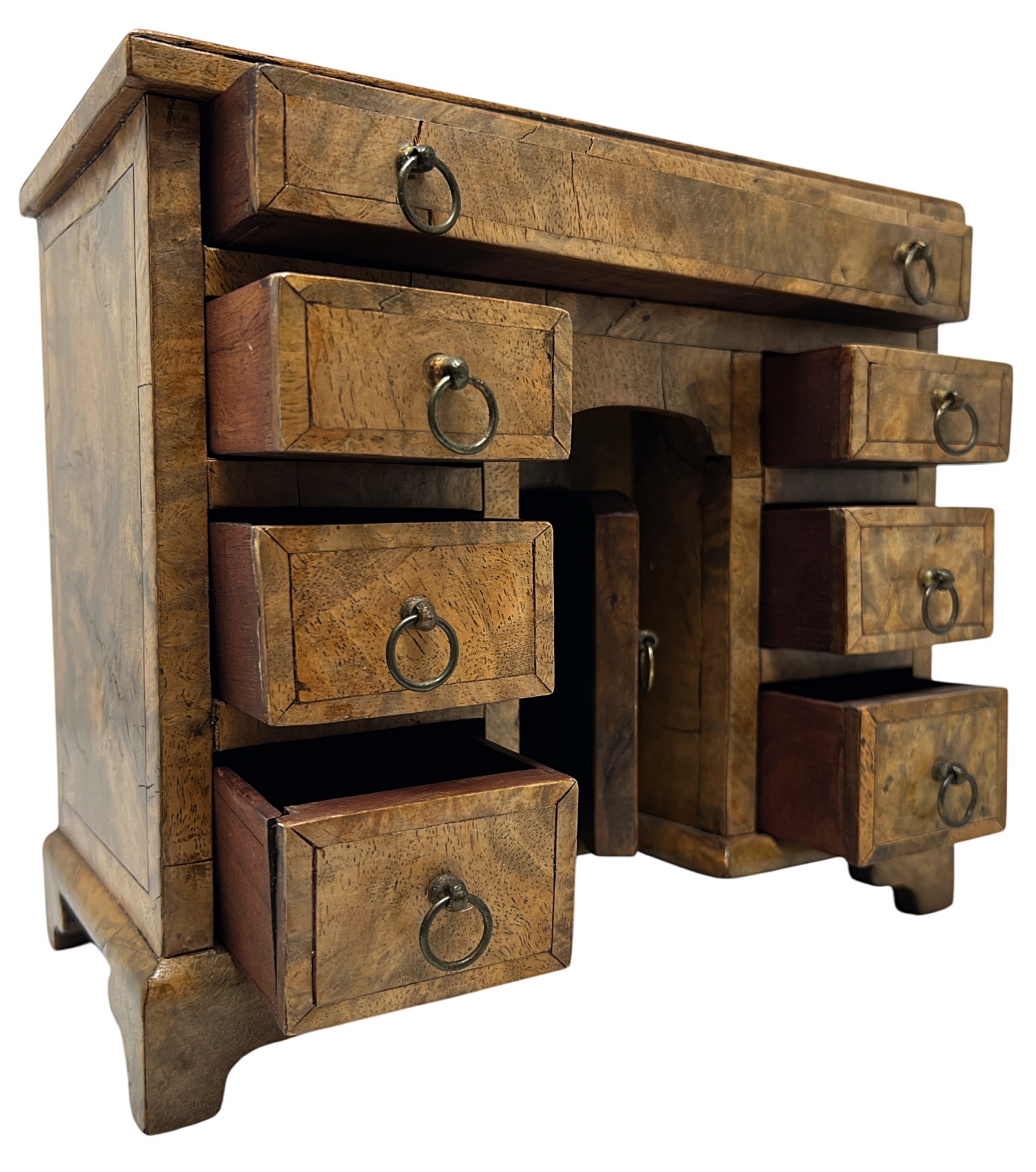 Furniture, GeneralThis rare and finely crafted miniature kneehole desk is a superb example of an apprentice piece or a traveling salesman’s sample, capturing the grandeur of early 18th-century George II (c. 1730-1750) furniture in a compact, tabletop form. The piece is masterfully veneered in highly figured burr walnut, showcasing the dramatic swirling grain and “pip” clusters prized by Georgian cabinetmakers. The wood has aged to a beautifully mellowed golden-honey patina, a characteristic of authentic antique walnut that has lightened over centuries. The top and drawer fronts are elegantly finished with cross-banded borders, a hallmark of high-quality period craftsmanship.