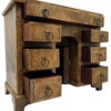 The design is a traditional arrangement featuring one long frieze drawer above six smaller side drawers, flanking a central recessed “kneehole” cupboard. Raised on classic bracket feet with a molded base, providing a sturdy and balanced silhouette. The period-style brass ring handles adorn each drawer and the kneehole cabinet door, complementing the warm tones of the walnut. This miniature retains the exacting proportions and functional drawer construction of a full-sized desk.