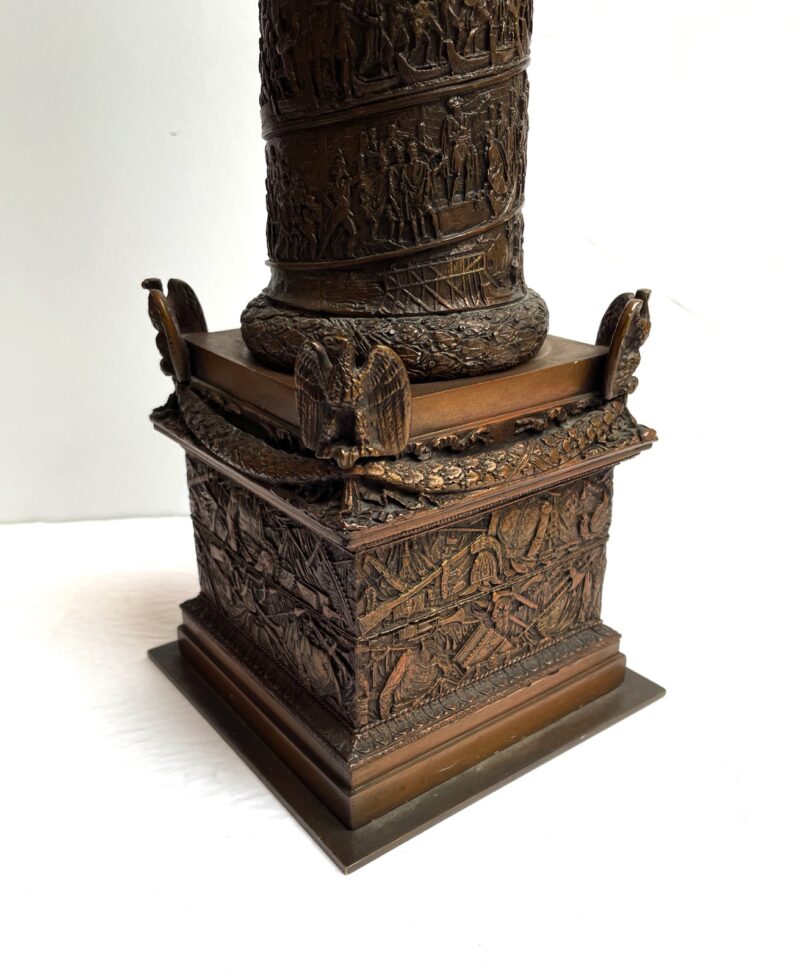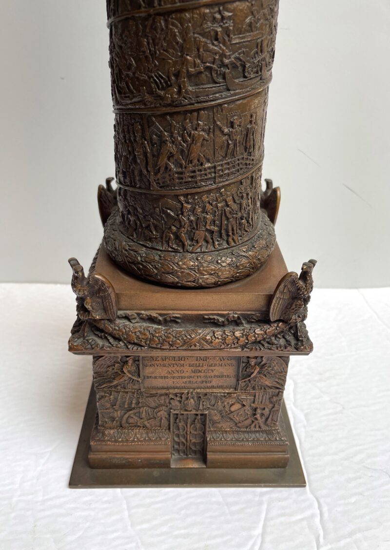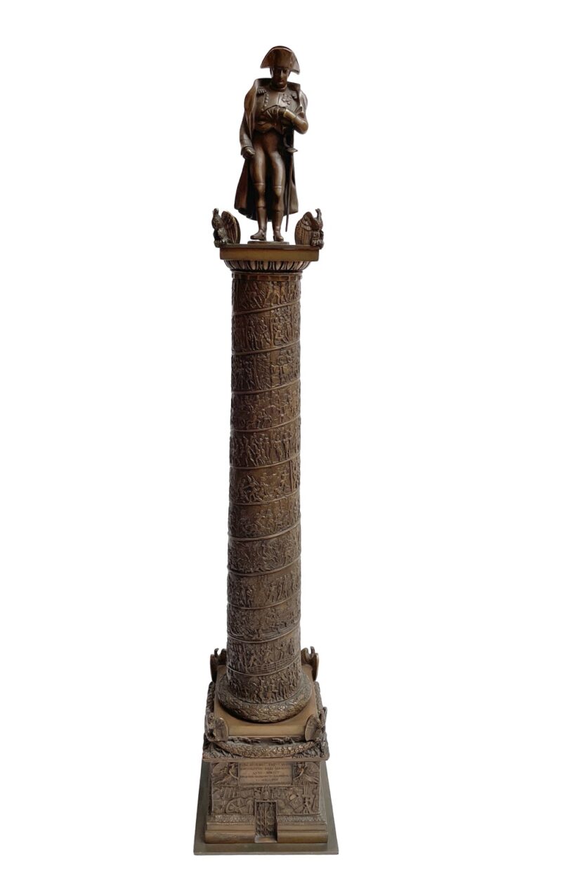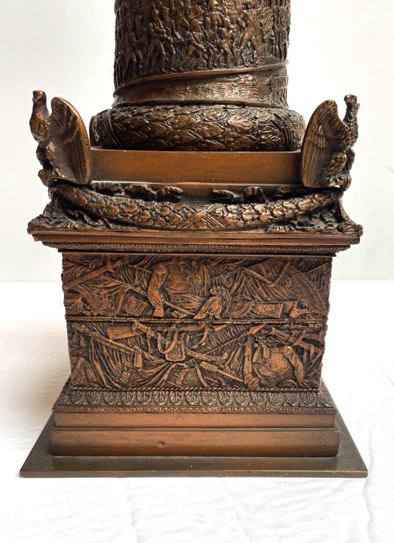 An impressive, large bronze replica of the Vendôme Column monument in Paris, France.  The original Column stands in Place Vendôme square in Paris and was erected in 1811 during Napoleon Bonaparte’s rule after the French revolution.  This model showed Napoleon dressed as a Roman Emperor which was later melted and replaced with Napoleon in his ‘redingote’ coat and trademark hat in the 1830’s during Louis Philippe’s reign.  The model of Napoleon was once again replaced in 1851 with the Roman Emperor Napoleon.  In 1871 the Column was toppled by Parisian citizens and it was rebuilt with the Roman Emperor Napoleon statue in 1875.