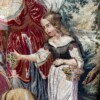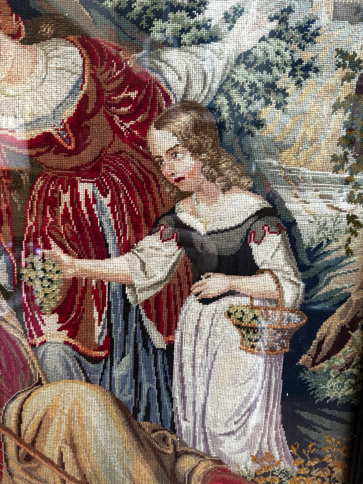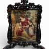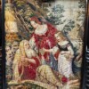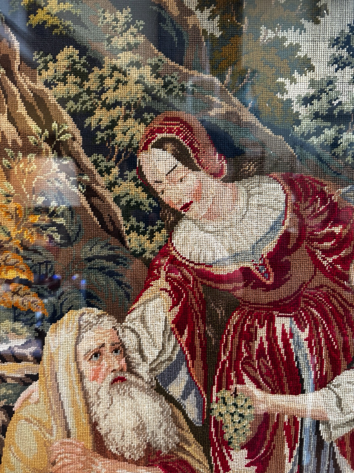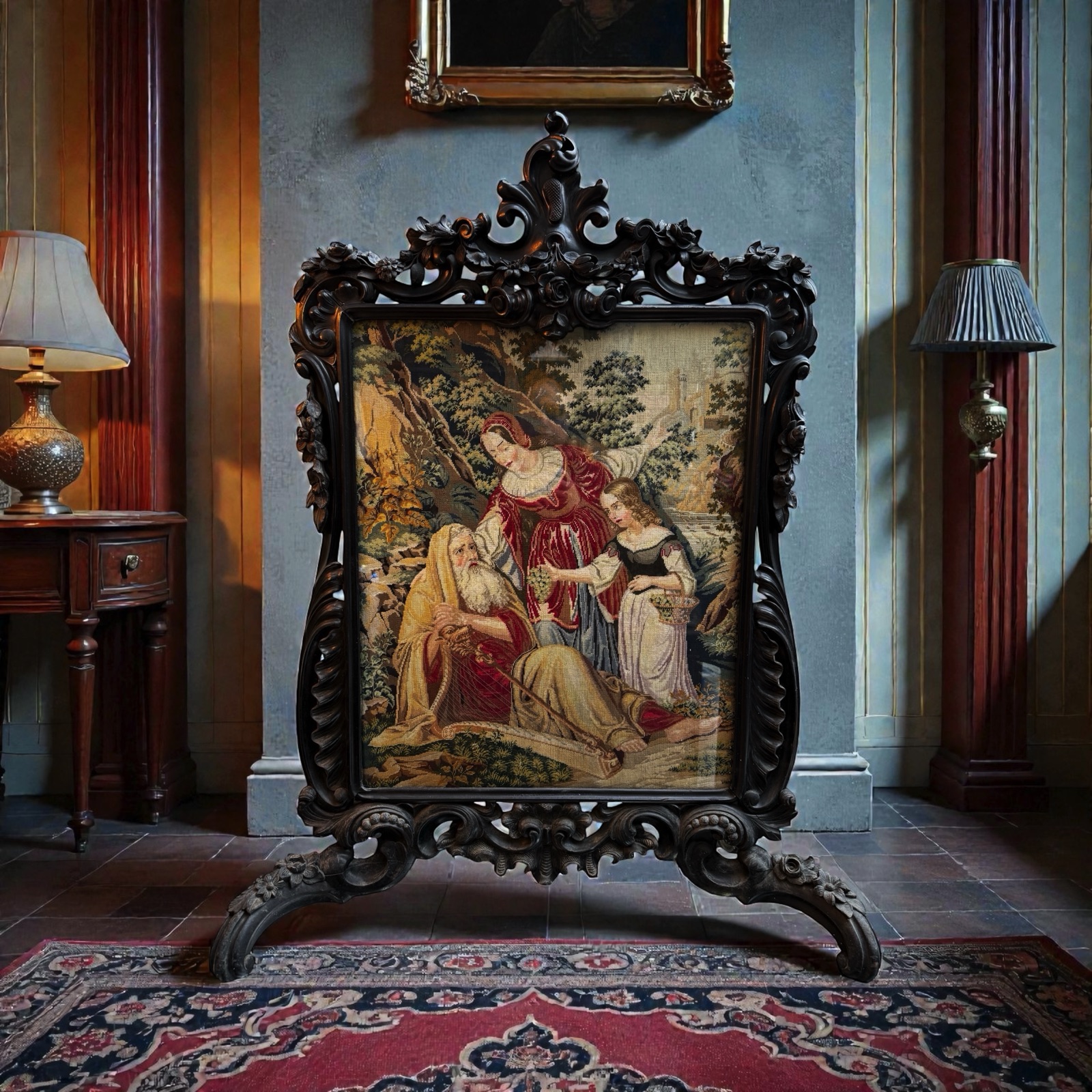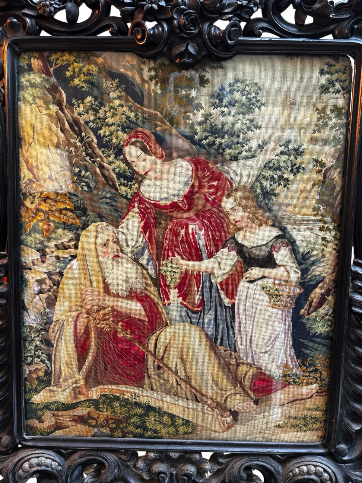 FurnitureThis is a magnificent and rare 19th-century “Victorian Rococo Revival” screen and tapestry of impressive proportions. The central textile depicts the biblical King David in a lush, classically rendered landscape. King David is in his later years, identified by his signature harp. He is shown in a lush classically rendered landscape, being attended to by two female figures traditionally interpreted as Bathsheba and Abishag. The needlepoint artistry is exceptionally fine, with a rich palette and expressive detailing in the figures’ faces and garments.