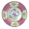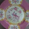 Lovely bright pink patterned dinner plates in the “Pink Cockatrice” pattern by Mintons.