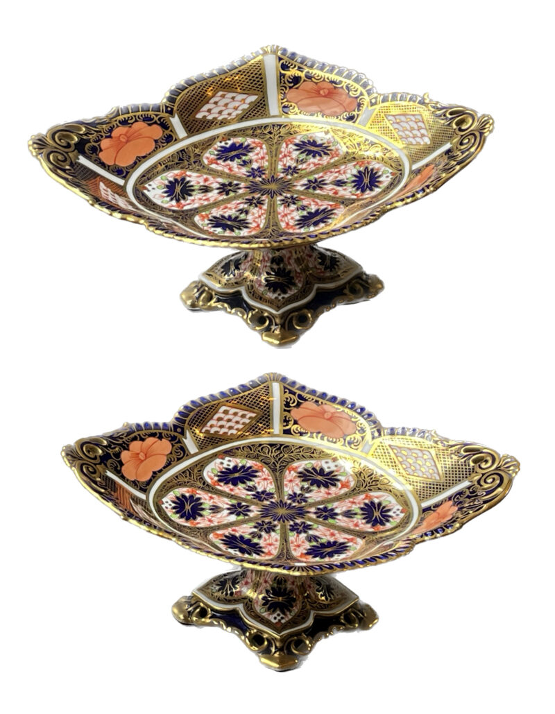 Rare Pair of Early Royal Crown Derby 1128 – Old Imari Pedestal Compotes dated 1910 & 1911