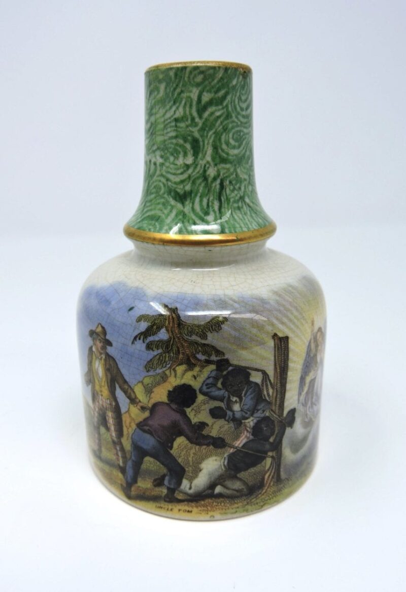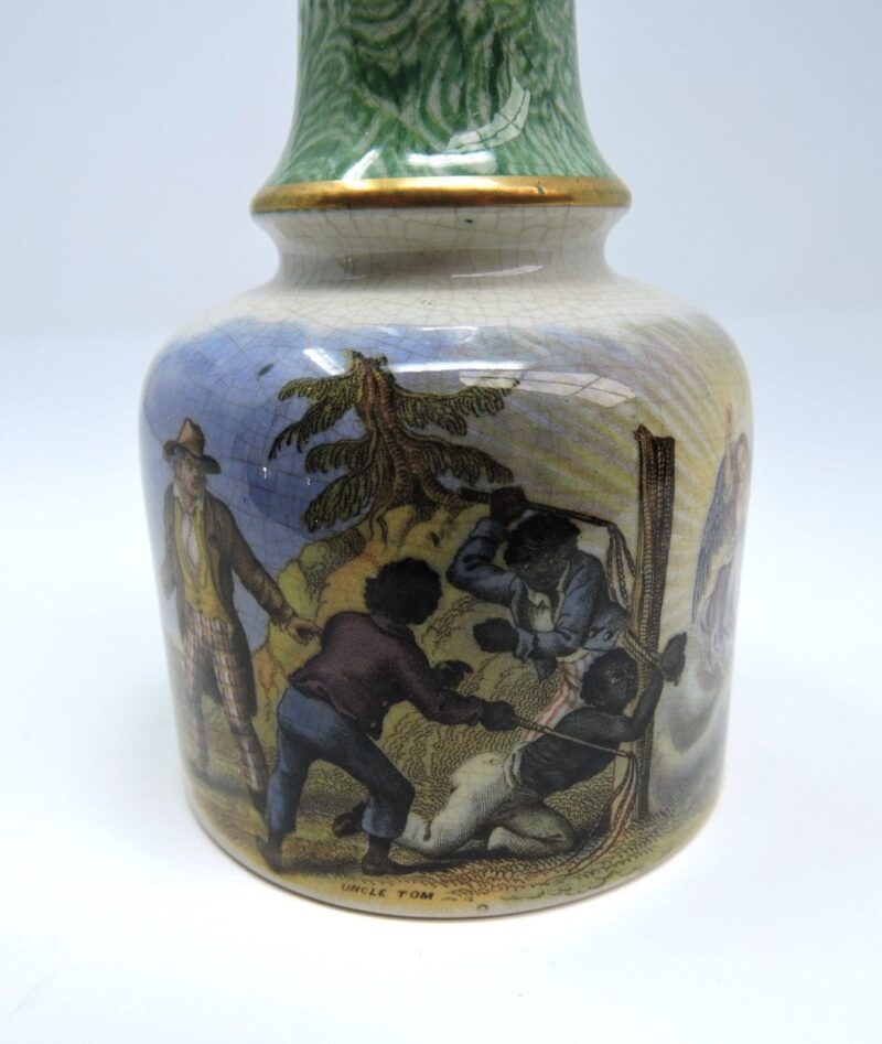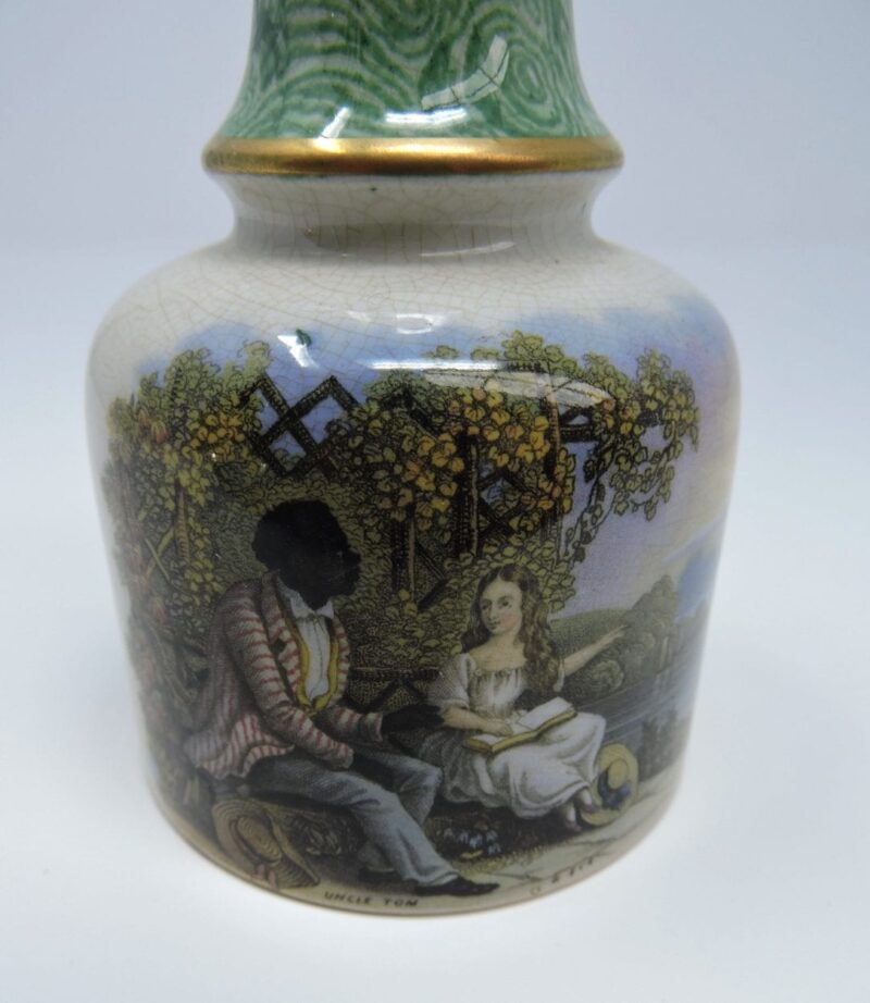 On the body are two scenes: on one side it is titled “Uncle Tom” On the other side, it is titled “Uncle Tom and Eva” and shows the two characters sitting in front of a bower overlooking a lake. Eva has a book in her lap and is pointing toward the lake while Tom is speaking with her.