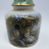 The bottle has a white background with a gilt line separating the bottom from the green and white mottled top. The rim of the top is also in gold paint.