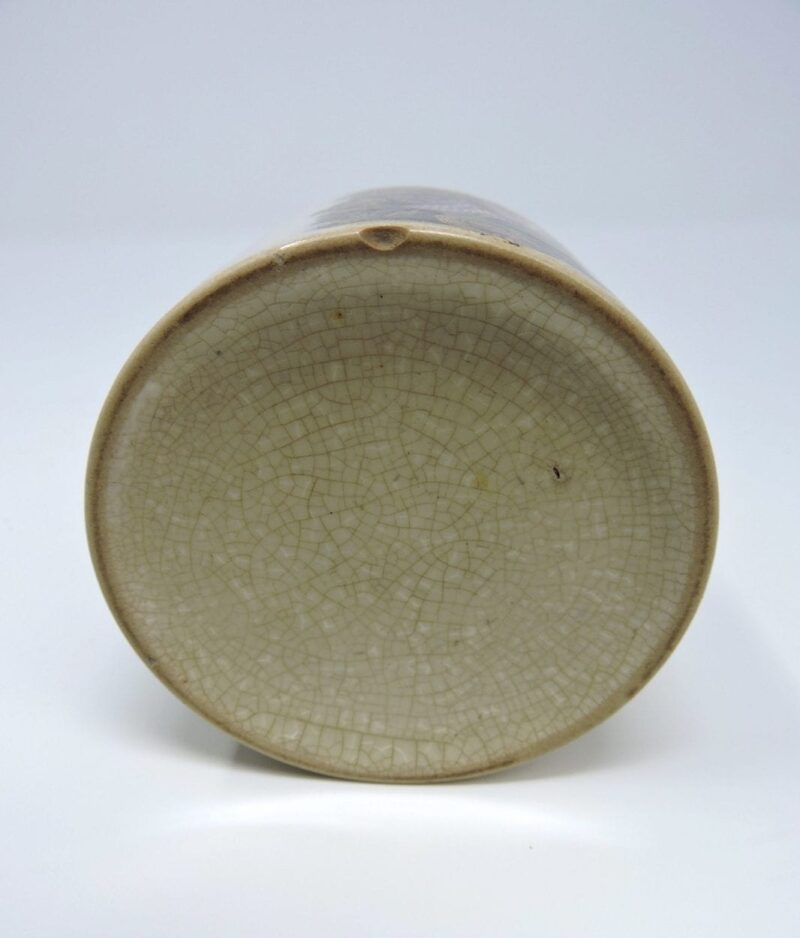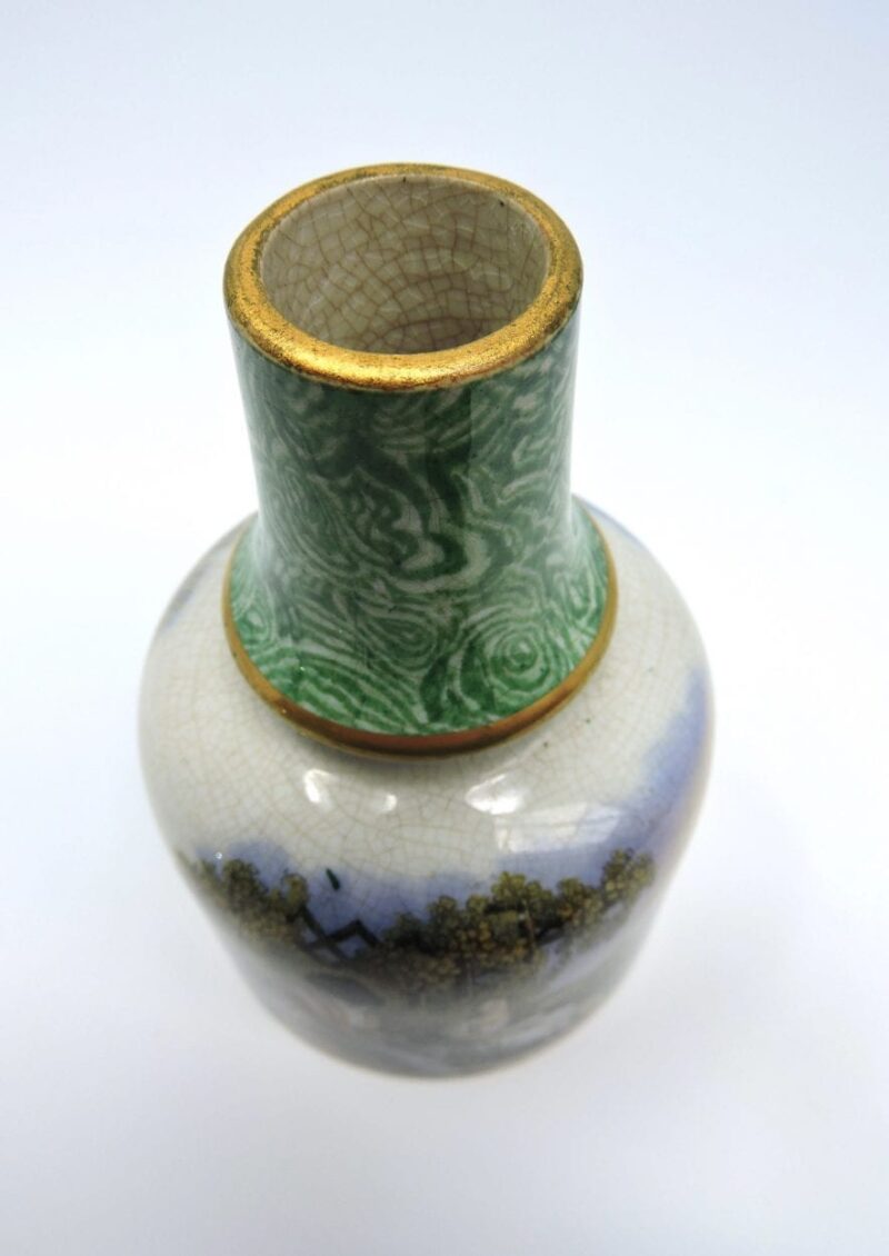 The bottle is 4 1/2 inches tall and 3 inches wide at the base. There is some age crackling on the body of the vase and one small chip on the underside of the base. The length of the bottle probably cut down and the rim over painted in gold.  Otherwise the piece is in good condition.