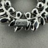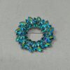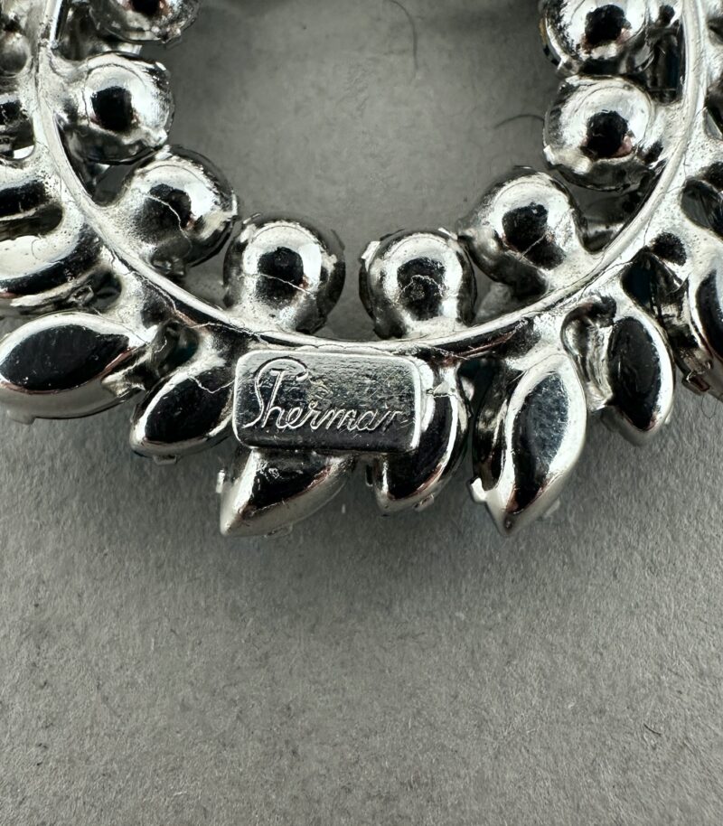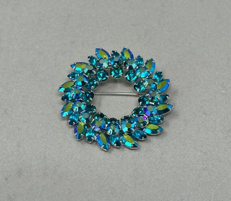 This Sherman brooch has some amazing vibrant colours, teal and teal “Aurora Borealis”, which are layered on top of each other. The brooch has three rounds of rhinestones that refract light beautifully. Sherman is based in Montreal and is very sought after for their exceptional craftsmanship.