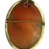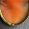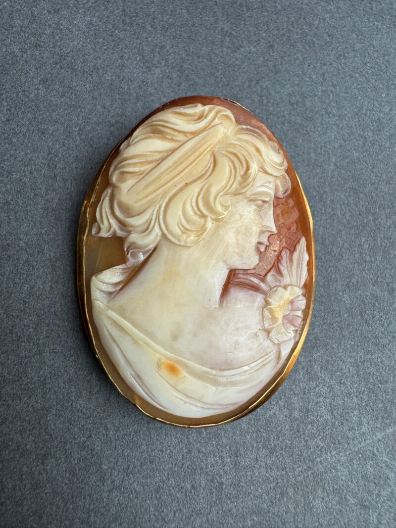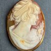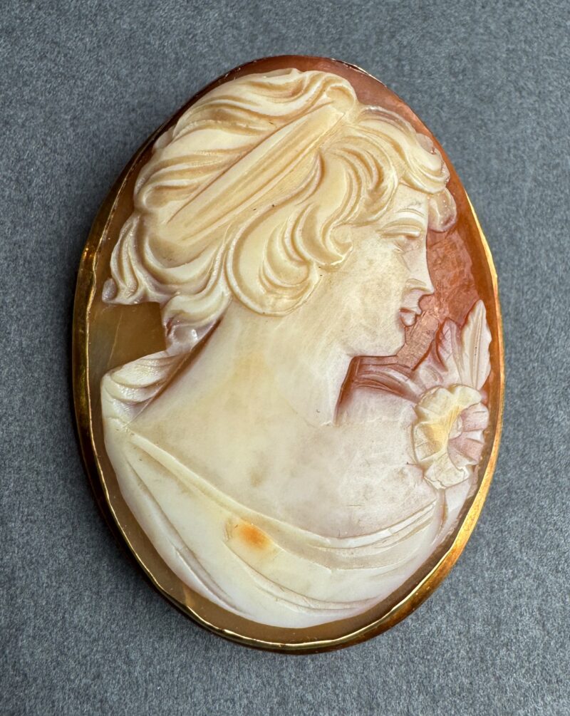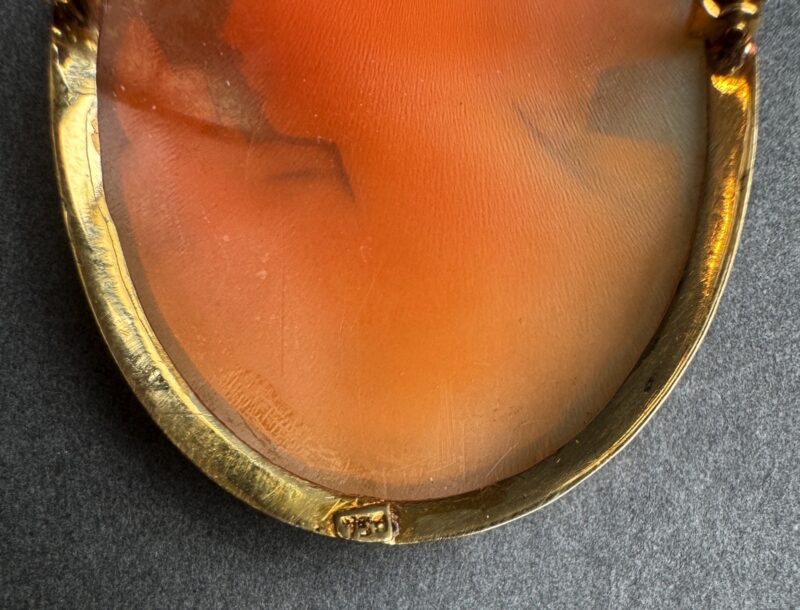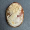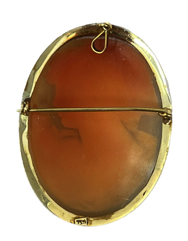 A lovely cameo set in an 18 Karat yellow gold frame (marked 750 gold). This antique cameo is a vertical image of a beautiful young woman in a “formal style” with a shoulder dress corsage & sweeping hairstyle. There is a “bale” and “pin” for versatility. Can be worn as a pendant or brooch. Note: The cameo is ” hand carved ” as shown in it’s depth of relief and slight imperfections.