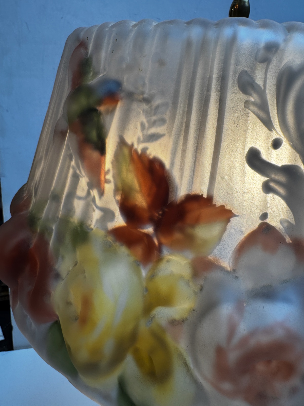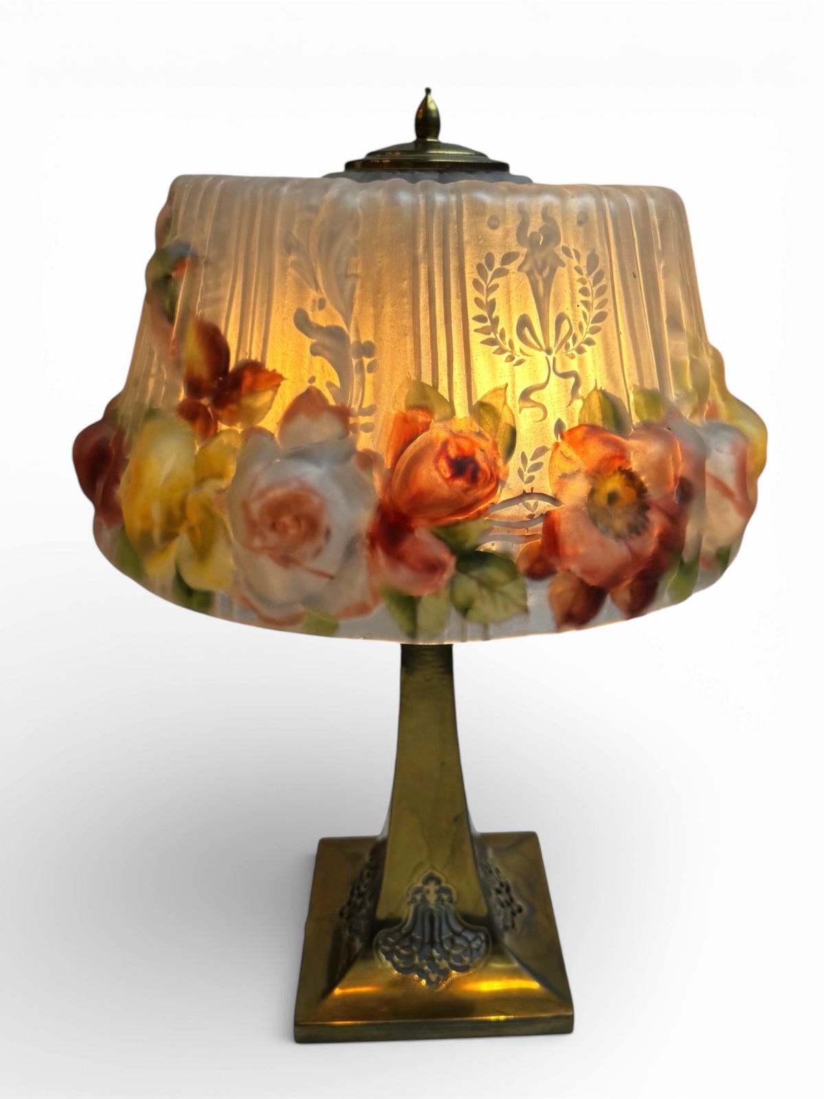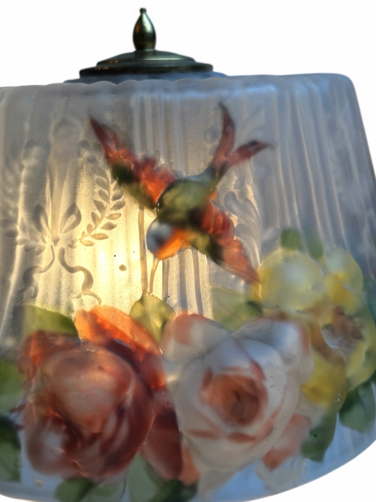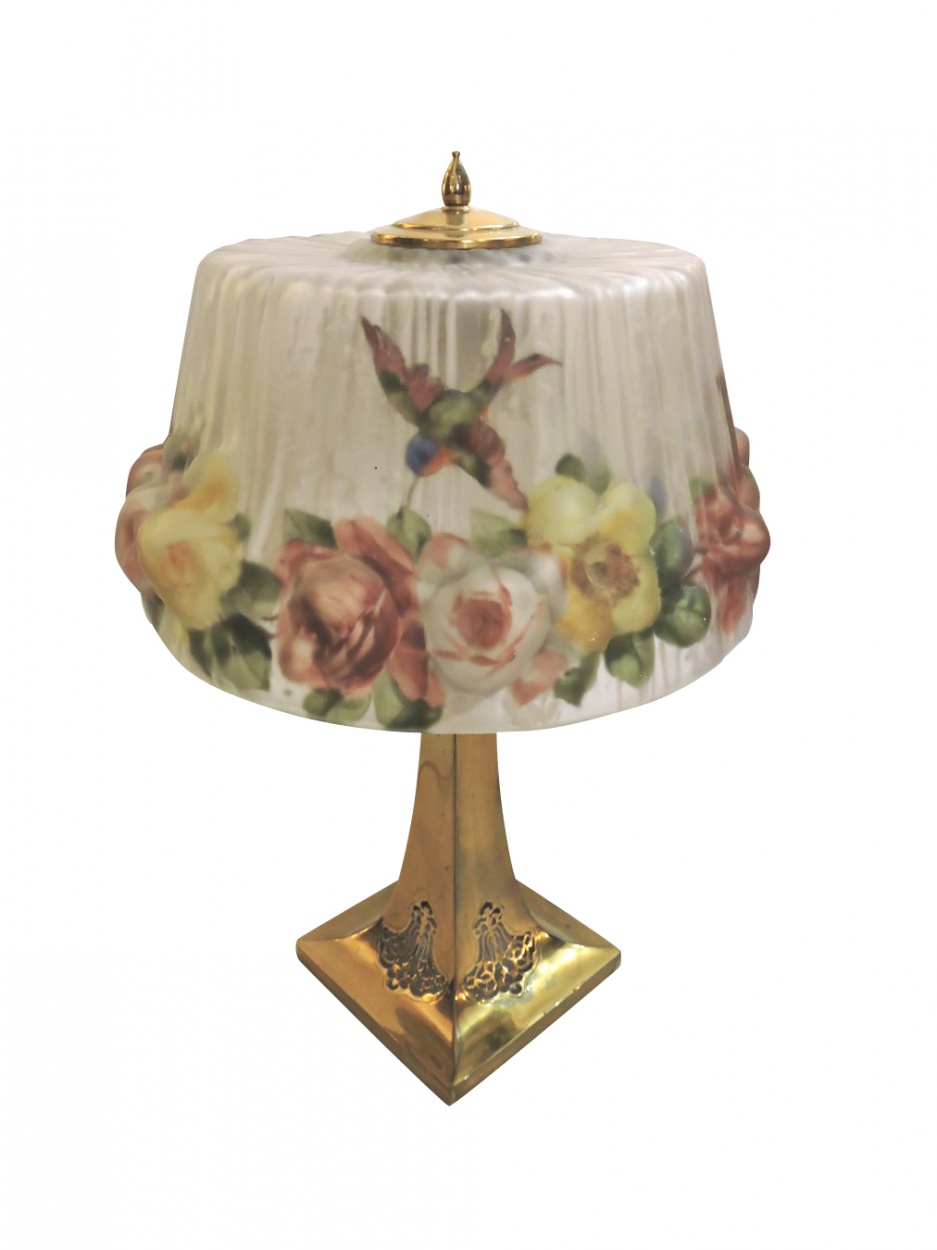An absolutely beautiful Pairpoint puffy table lamp, fitted with the highly desirable Stratford shade, featuring delicately rendered hummingbirds and roses in rich, luminous tones. When illuminated, the shade glows warmly, highlighting the intricate floral decoration and fine detail that Pairpoint is celebrated for.