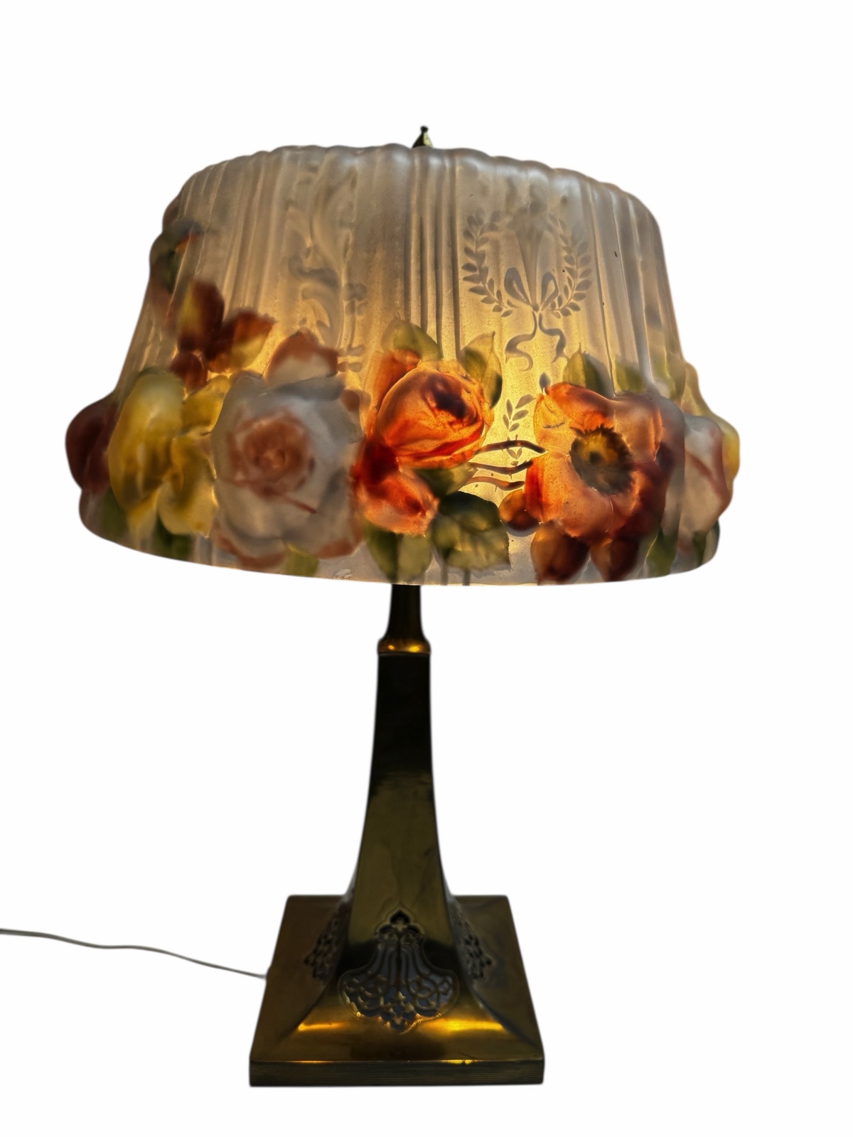 The lamp retains its original Pairpoint base, which is signed and numbered, an important detail for collectors. This example comes directly from the original family, having been received as a wedding gift in 1915, offering exceptional provenance.