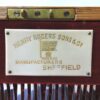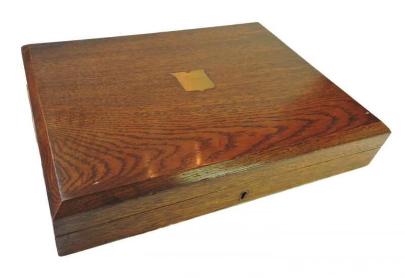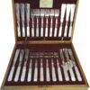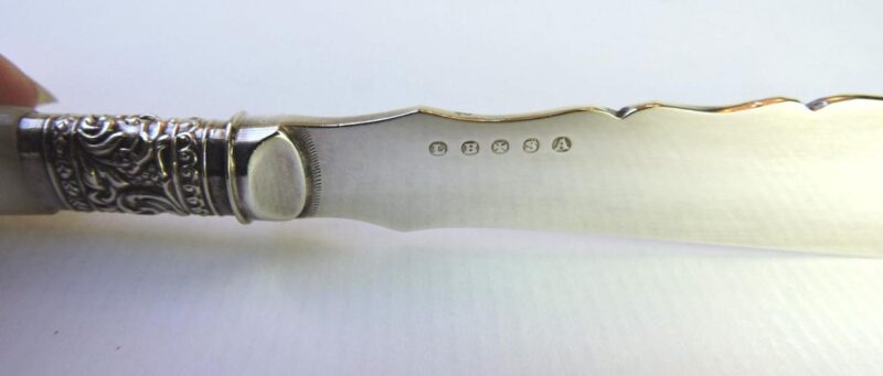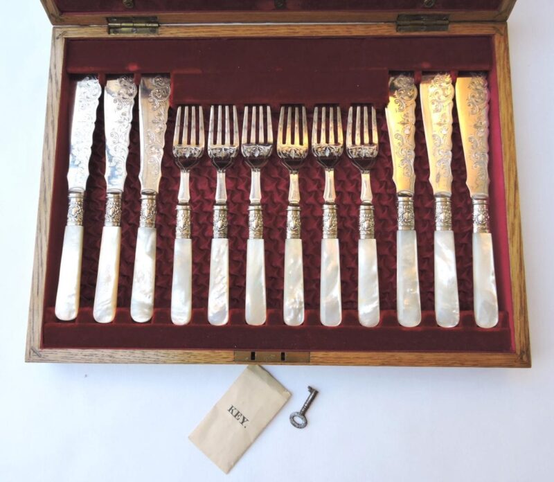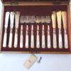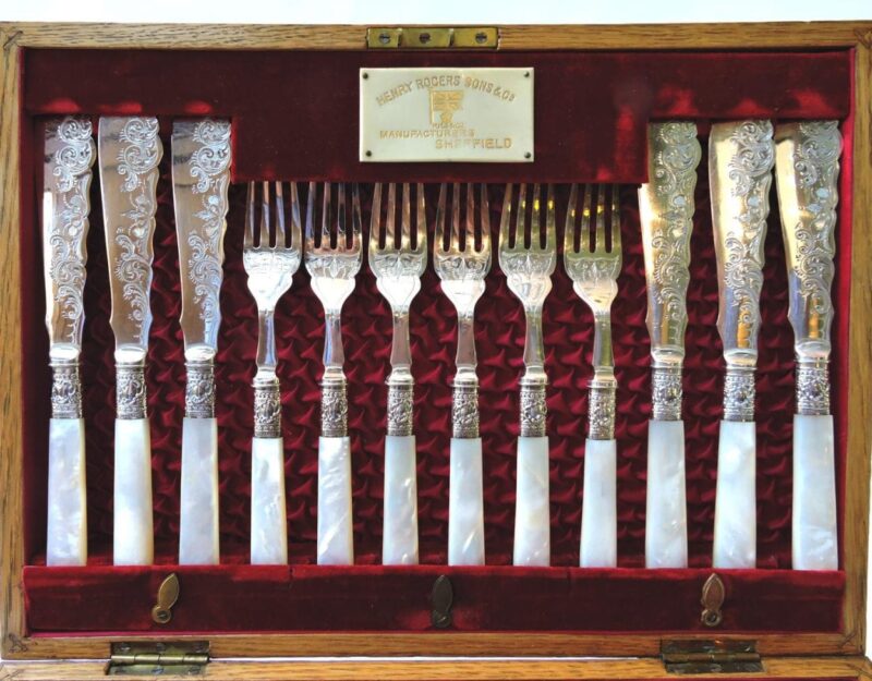 A lovely fish set for 12 with mother of pearl handles and sterling bands, housed in their original wooden box. The set is made retailed through Henry Rogers & Sons, Sheffield, as is marked by the plaque on the interior of the box. The bands separating the blades from the handles are stamped “sterling” and the blades are marked “LB SA” with a Maltese Cross in the Centre between letters – for Levesley Brothers of Sheffield.