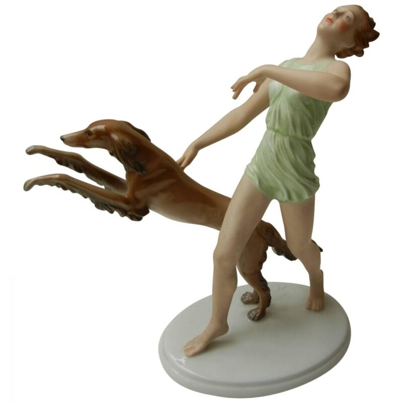 Rosenthal Art Deco Porcelain Running Lady & Saluki Dog Designed by Gustav Oppel