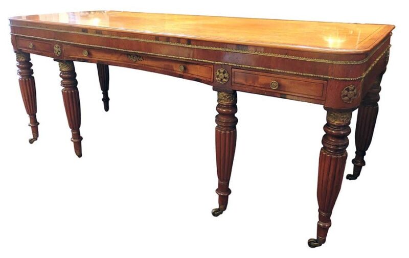 A long low mahogany server in Mahogany & Rosewood – transitional from Regency period to the Wm IV period, England, circa 1830. 6 thick reeded carved legs on castors,  3 small thin drawers, and decorative bronze hardware .