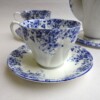 A lovely coffee set in the Dainty Blue pattern.  This set is by Royal Albert (not Shelley) and consists of a tall coffee pot, 4 cups and saucers and a trivet for the coffee pot.