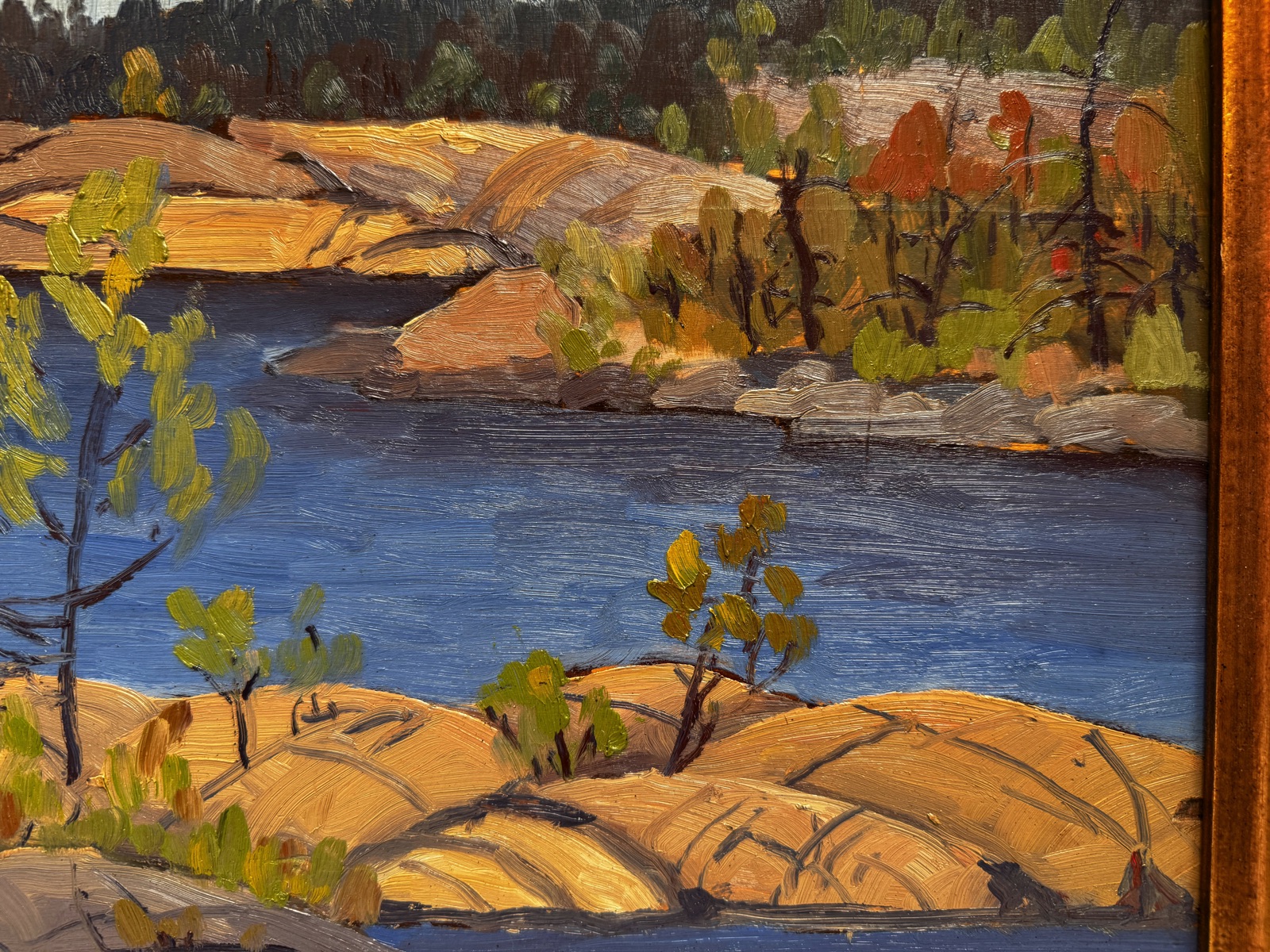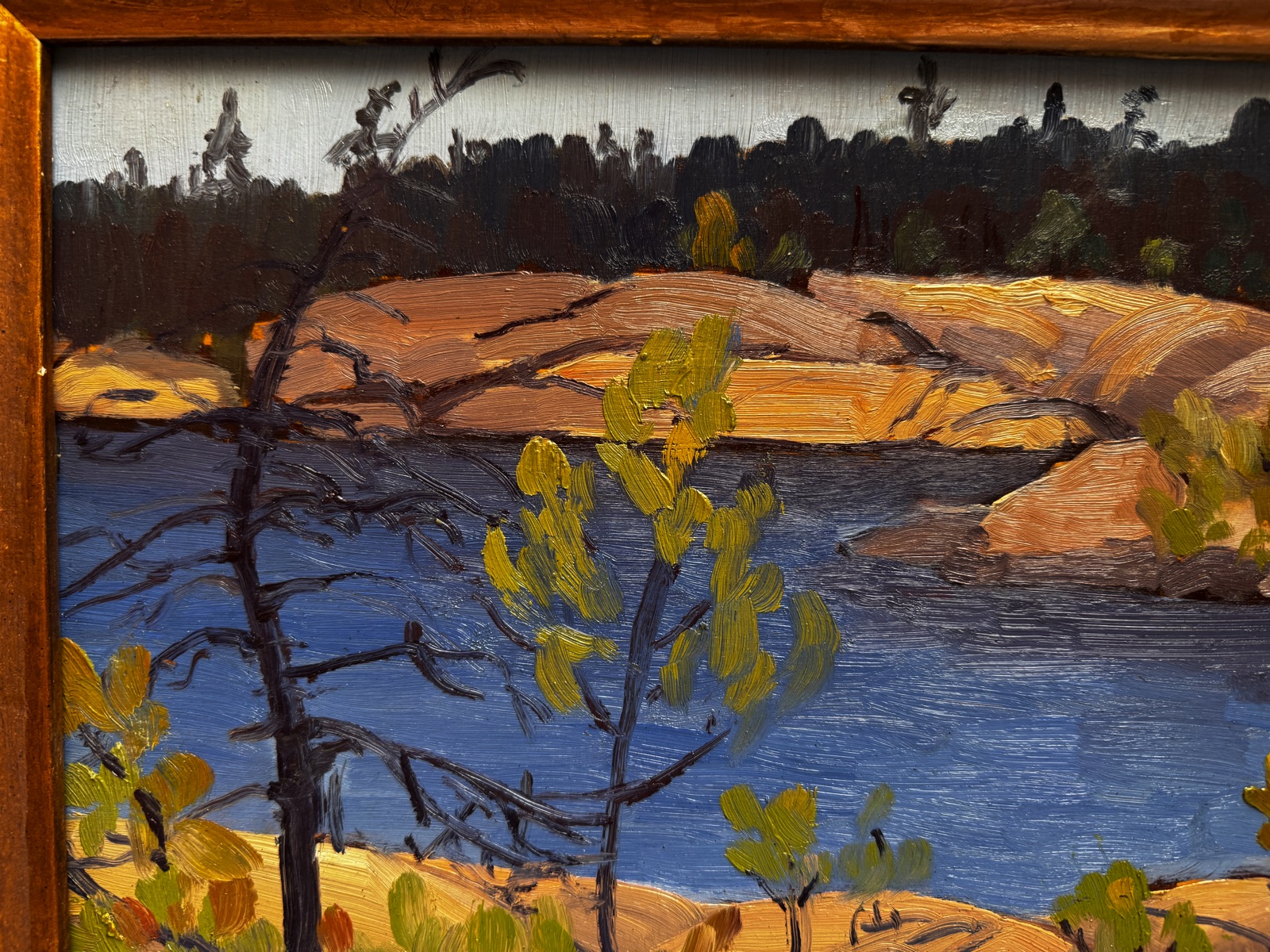 Painted in 1953, by William Fediow (1915-1953), “Pickerel River” is a well-known river system north of Parry Sound. This painting shows the enduring influence of the Group of Seven on mid-century Canadian landscape painting.  Like A.Y. Jackson, Fediow captured the quiet majesty of Northern Ontario with confident, rhythmic brushwork and a natural yet harmonious palette of greens, ochres, and blues. His treatment of light and reflection along the river’s edge conveys a deep familiarity with the terrain and a respect for its solitude.
