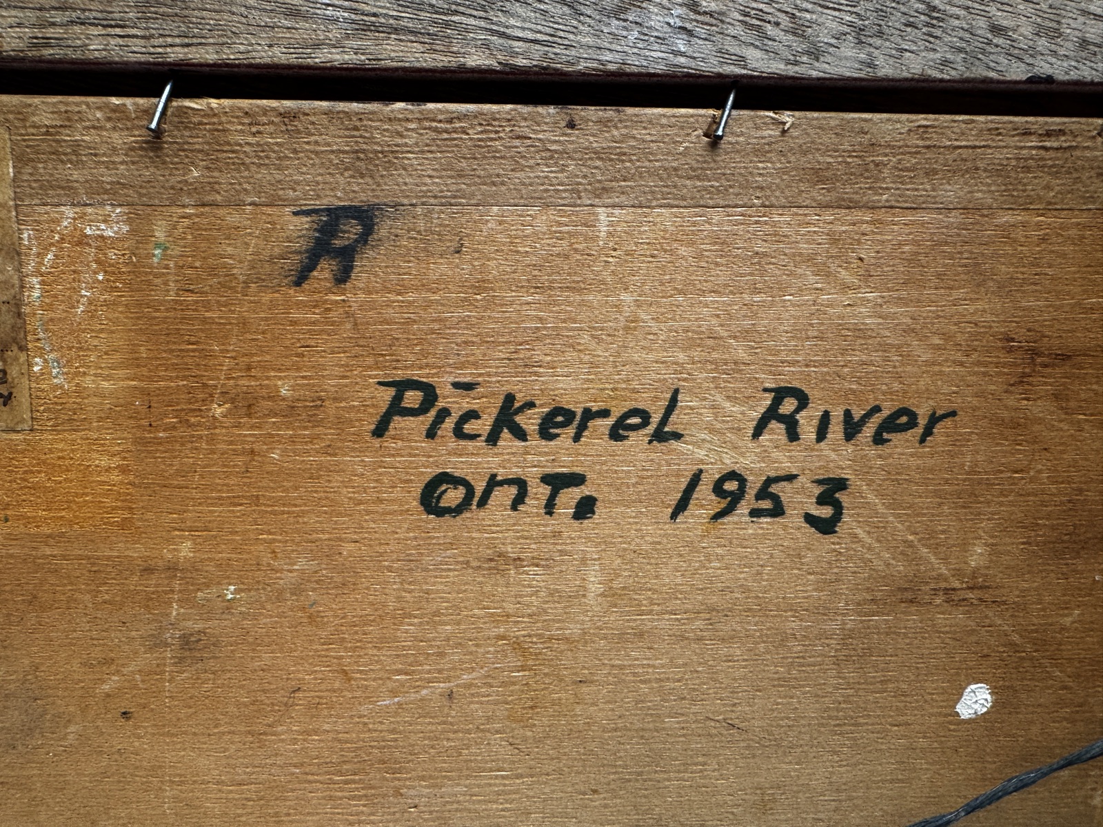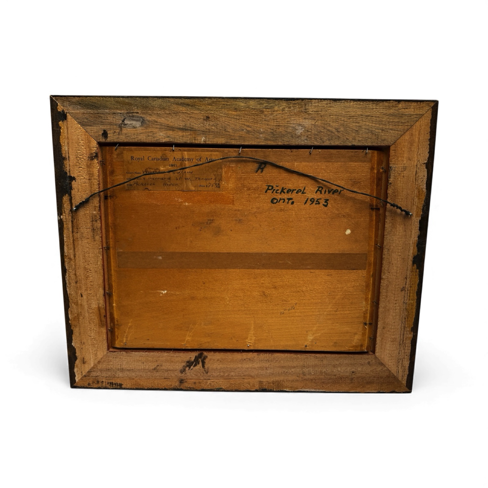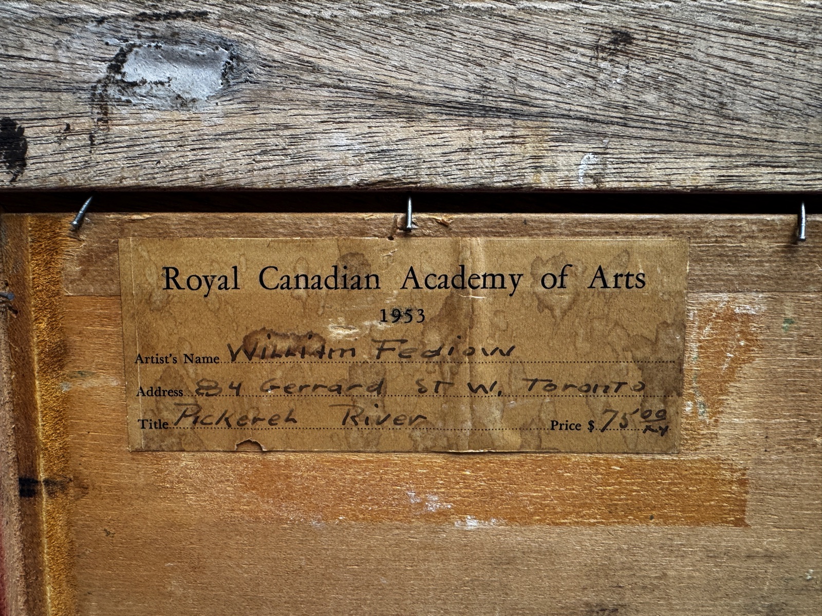 William Fediow and his artist wife Pauline Redsell-Fediow (1908-1980) lived and worked in Toronto and exhibited regionally in the 1940s-50s. Their professional files are held in the University of Toronto Art Museum (TAM). Signed by the artist lower front “Fediow 1953” and tagged on the reverse with the RCA exhibition label “Royal Canadian Academy of Arts- Toronto, 1953” and handwritten title “Pickerel River Ont. 1953″. Both he and his wife have listings with RCA.
