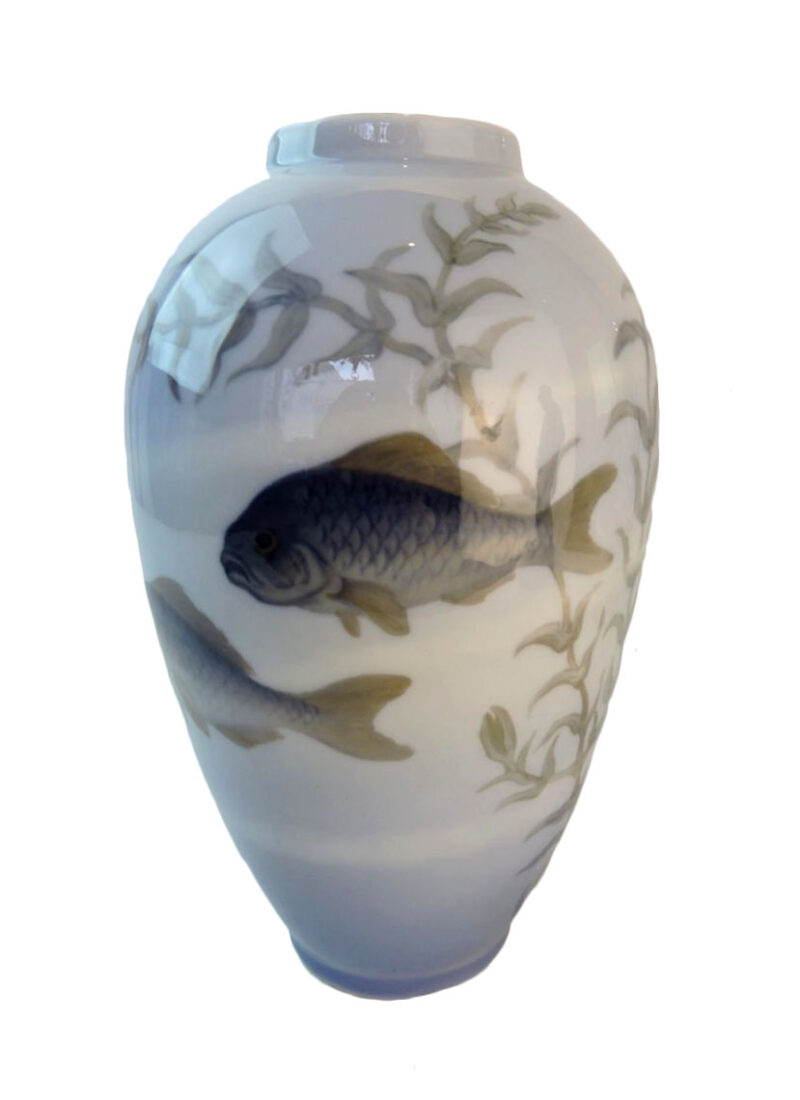 A wonderful Royal Copenhagen Denmark porcelain vase, showing two fish in a grouping of weeds.