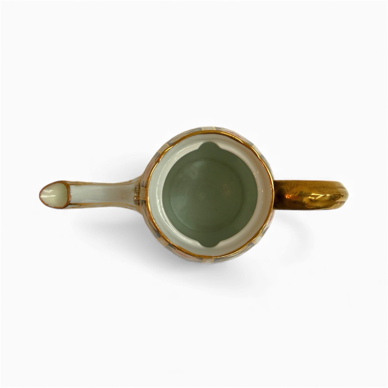 The body is decorated in deep cobalt blue, iron red, and soft peach tones, overlaid with elaborate 24-karat raised and flat gilt. Stylized florals and scrolling anthemion motifs wrap the surface with exceptional clarity and brightness. The gilt handle and spout remain crisp, showing little to no wear.