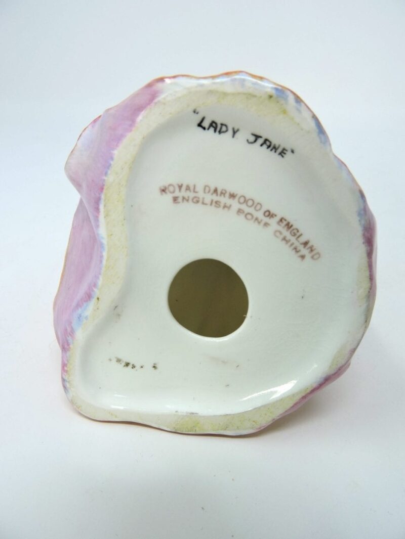 On the underside of the figurine, it reads “Royal Darwood of England. English Bone China” and has “Lady Jane” printed in black ink. There is also what appears to be a number near the bottom of the underside but it is not legible.