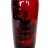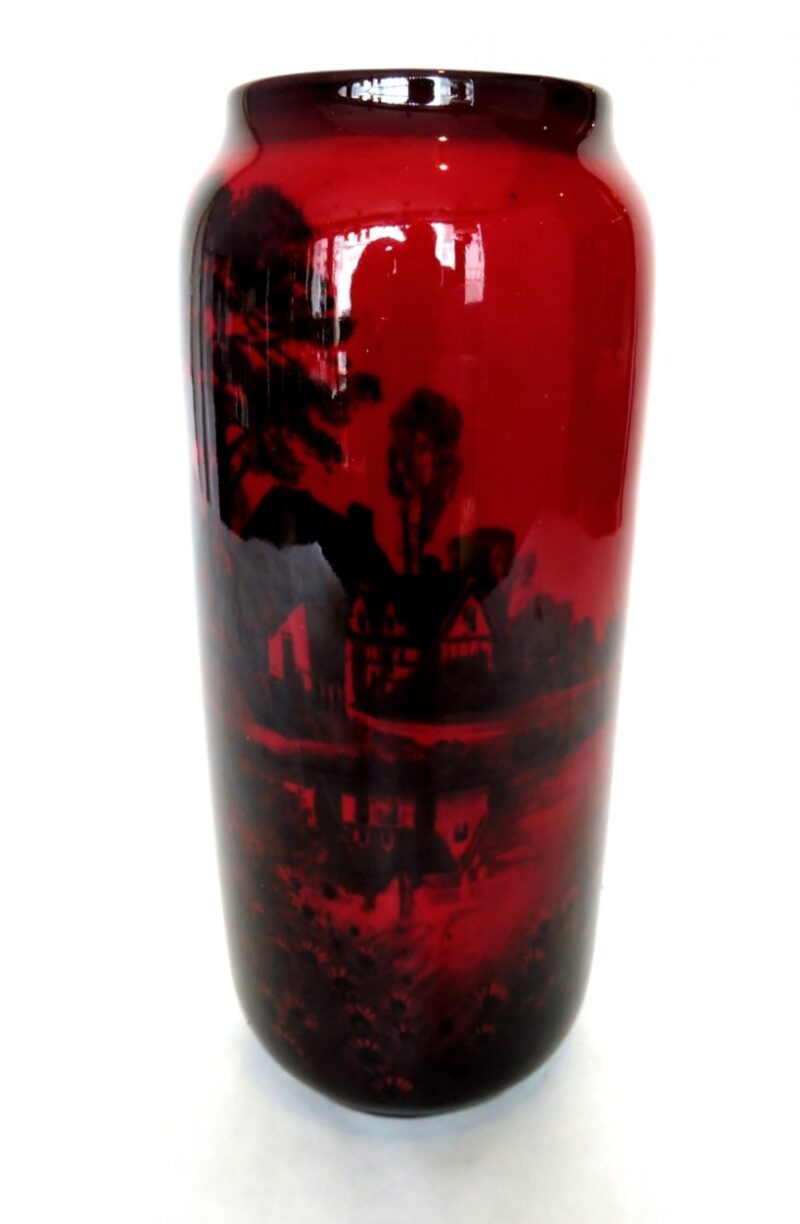 A lovely Royal Doulton English bone china “Flambe” vase in deep red, decorated with a country scene showing a thatched cottage, flowers, and trees.