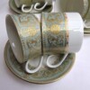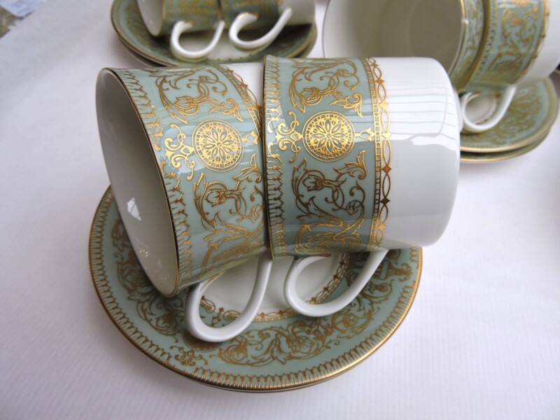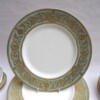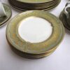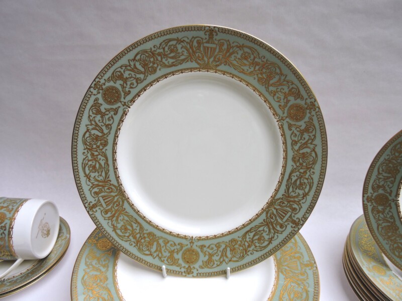 A dinner set for 8 in the ‘Balmoral’ pattern by Royal Worcester.  Pale green with heavy gold decoration over top.
