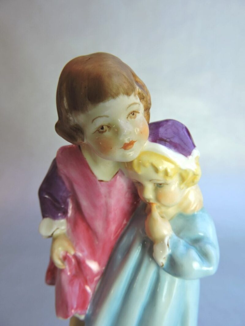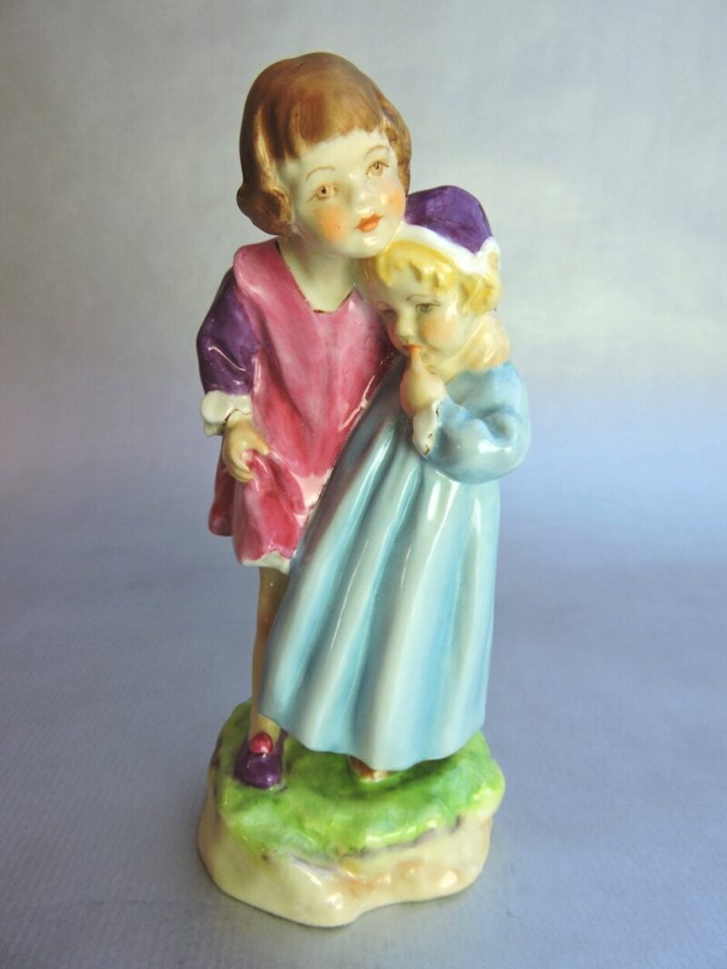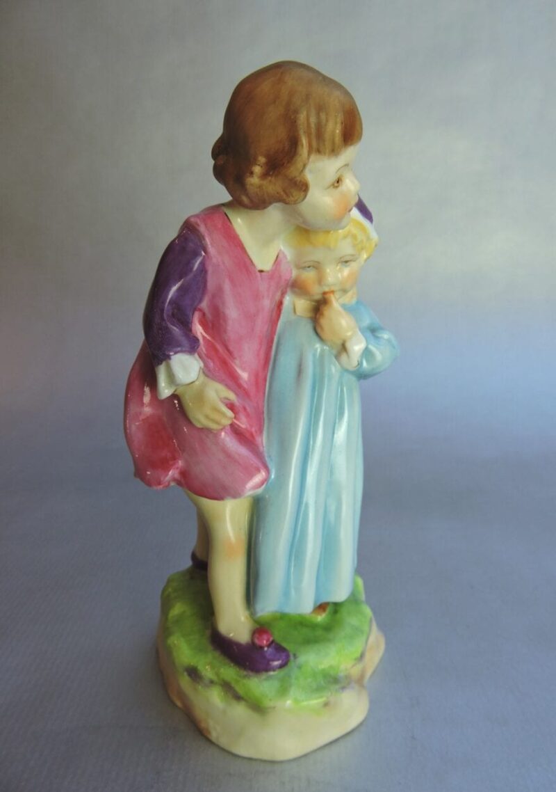 A sweet figural grouping called “Babes in the Wood” by Royal Worcester bone china. The piece consists of a young girl with her arm around the shoulders of a younger girl, perhaps her sister, who looks fearful, with her finger in her mouth.