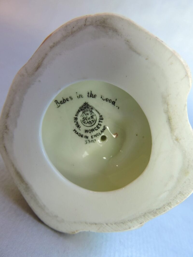 On the underside of the figurine is the Royal Worcester maker’s mark and it reads “Babes in the Wood. Bone China. Royal Worcester. Made in England. 3302”.