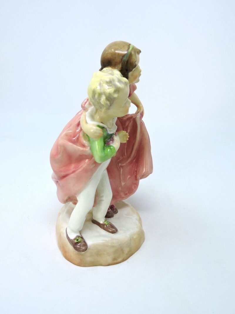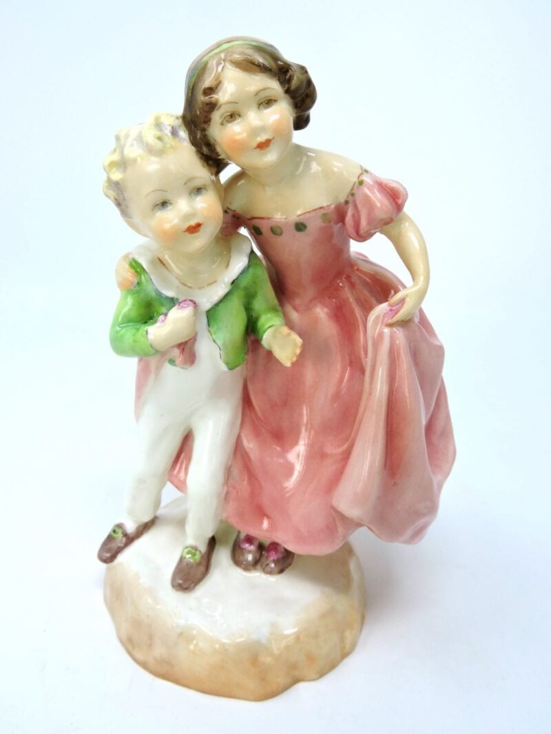 v** SOLD ARCHIVES **vHere is a wonderful Royal Worcester English bone china figural grouping, called “Sister”. It shows a young girl with her right arm around the shoulder of what seems to be her younger brother. She is holding her skirt in her left hand and her brother is holding the edge of her skirt in his right hand. The figural group is modelled by F.G. Doughty.