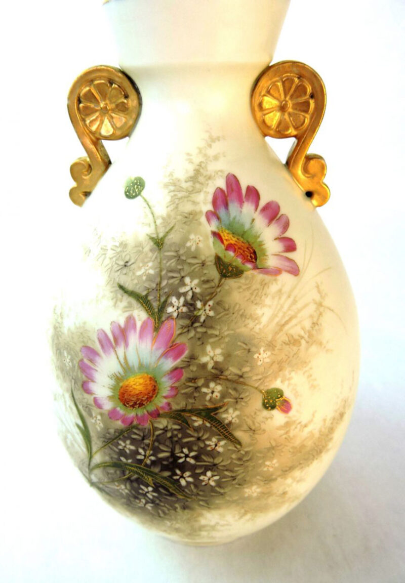 A lovely porcelain vase with delicate florals accented with gold on the flowers, the decorative handles, the rim and base. Grainger was purchased by Royal Worcester in 1889.
